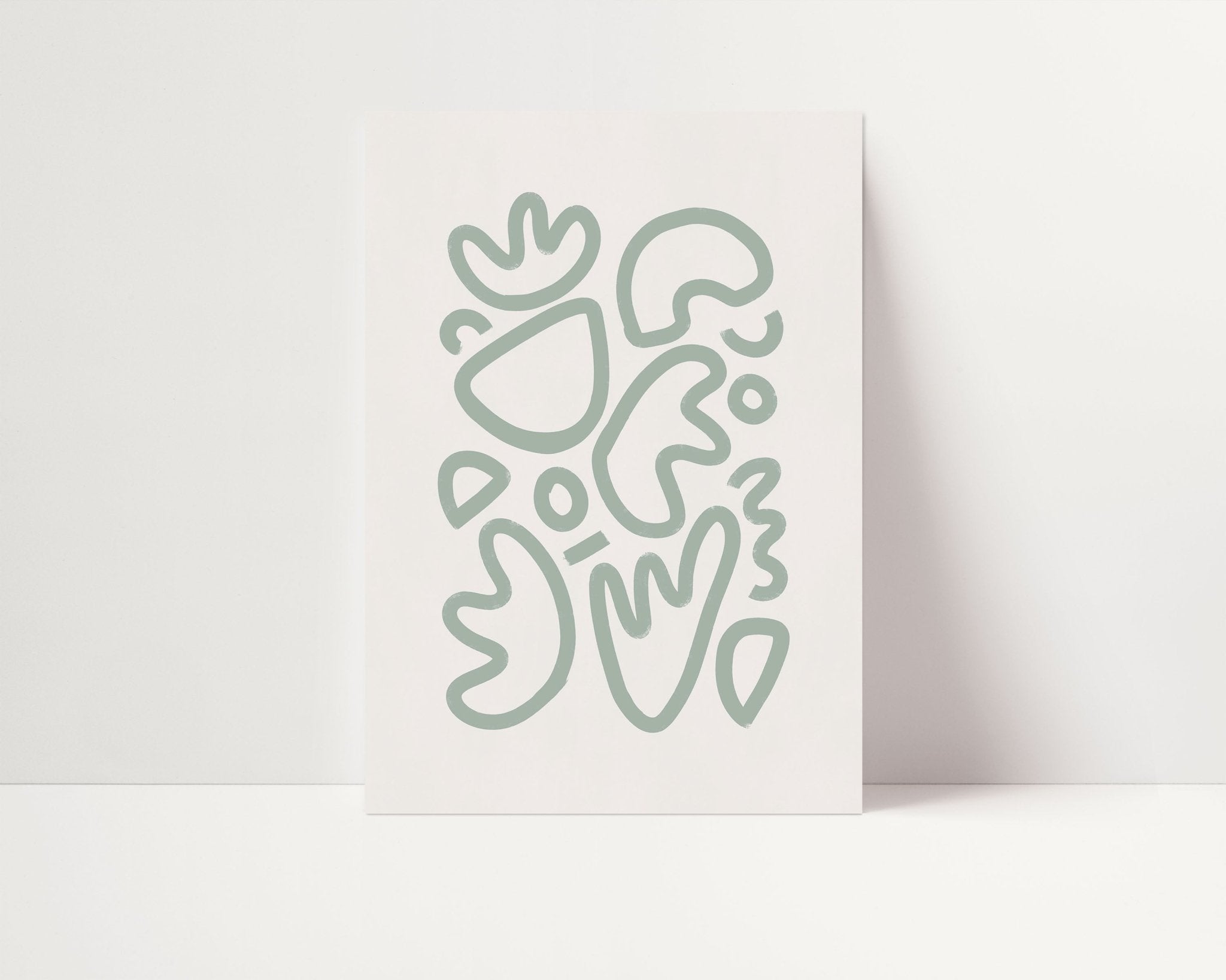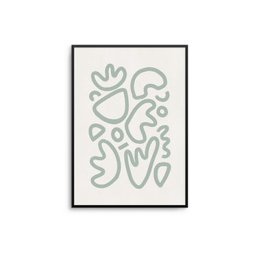 This unique Le Shapes poster brings elegant artistry to any room with its abstract shapes in sage green against a beige background. Ideal for adding a subtle and sophisticated touch to your décor.