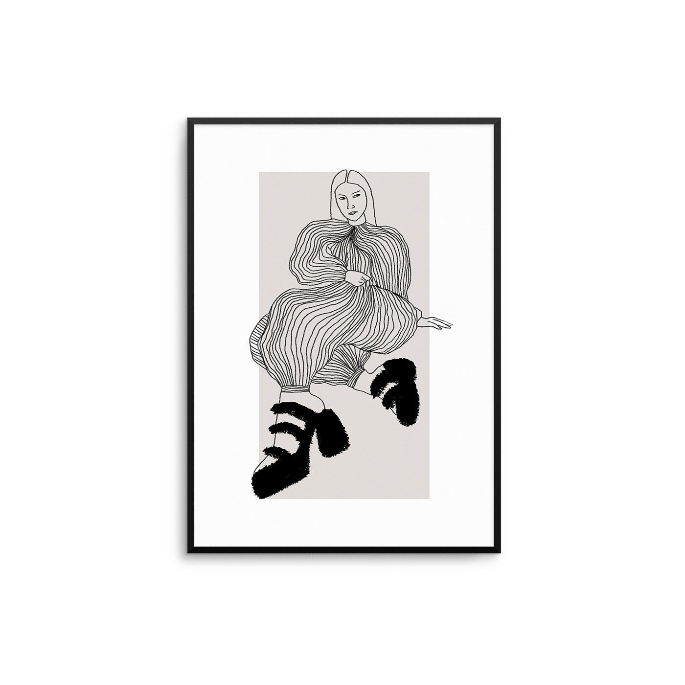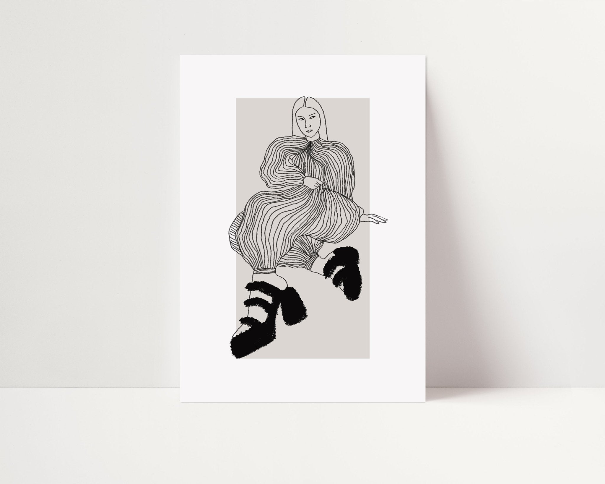 'Janina Lines - Female Portrait with statement shoes' line art illustration with greige background.