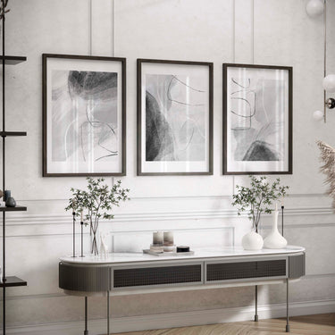 'Modern Abstract' grey, black and white unframed trio set of prints with a choice of a white border or borderless.