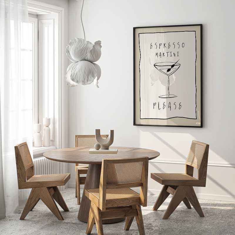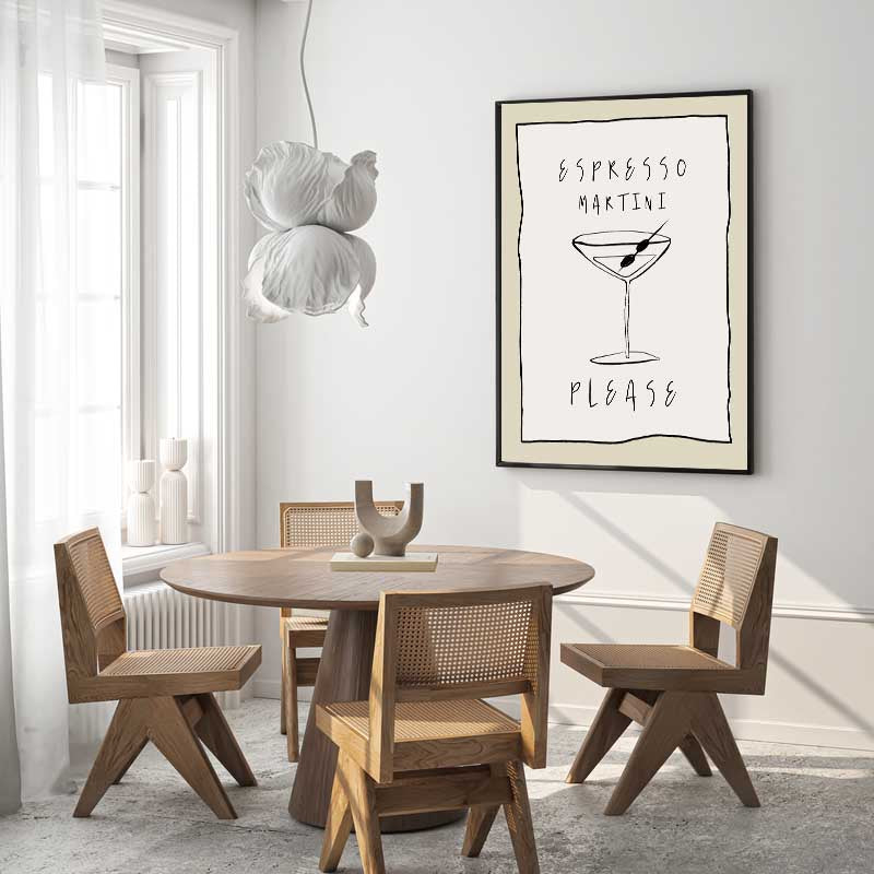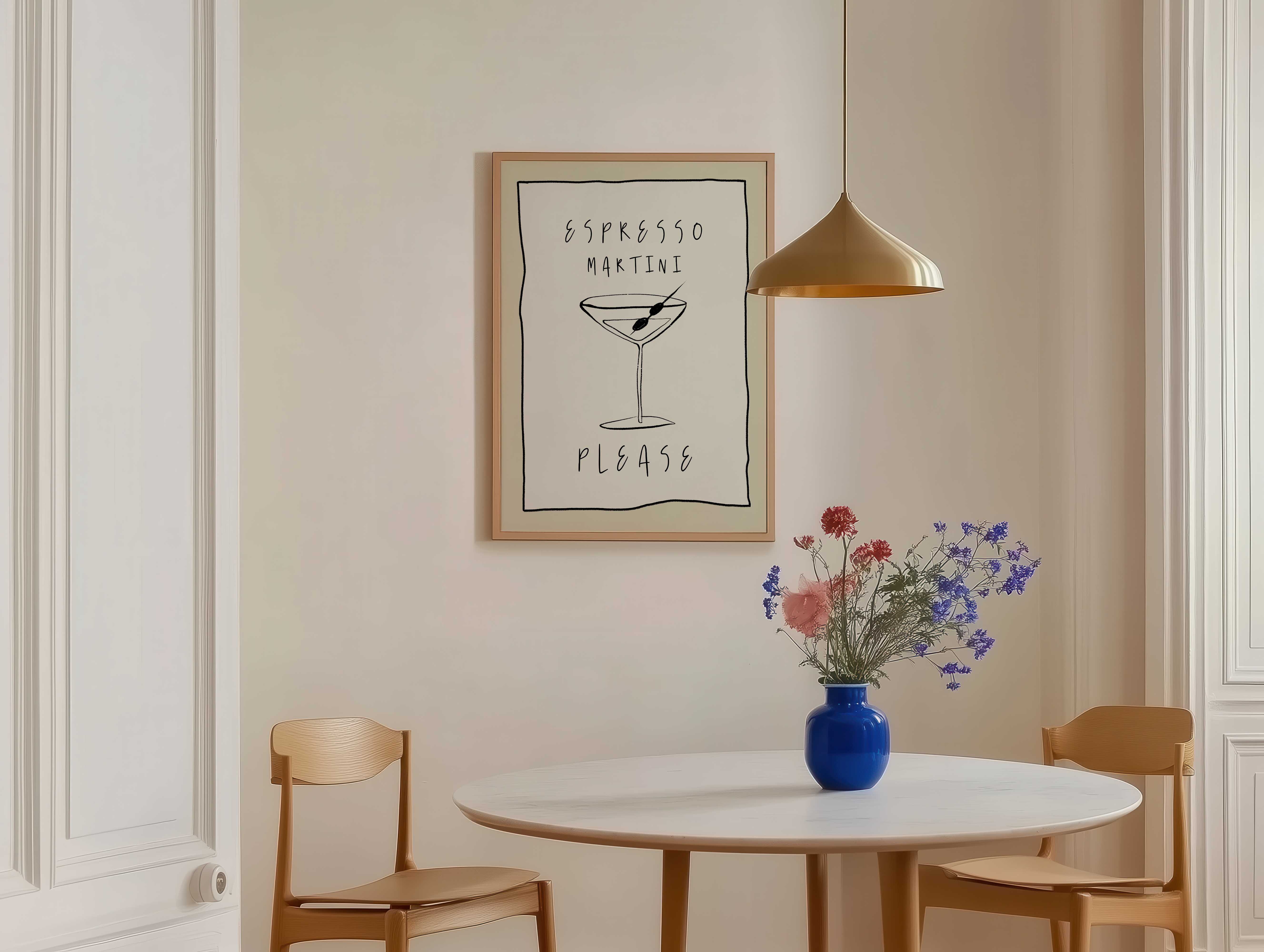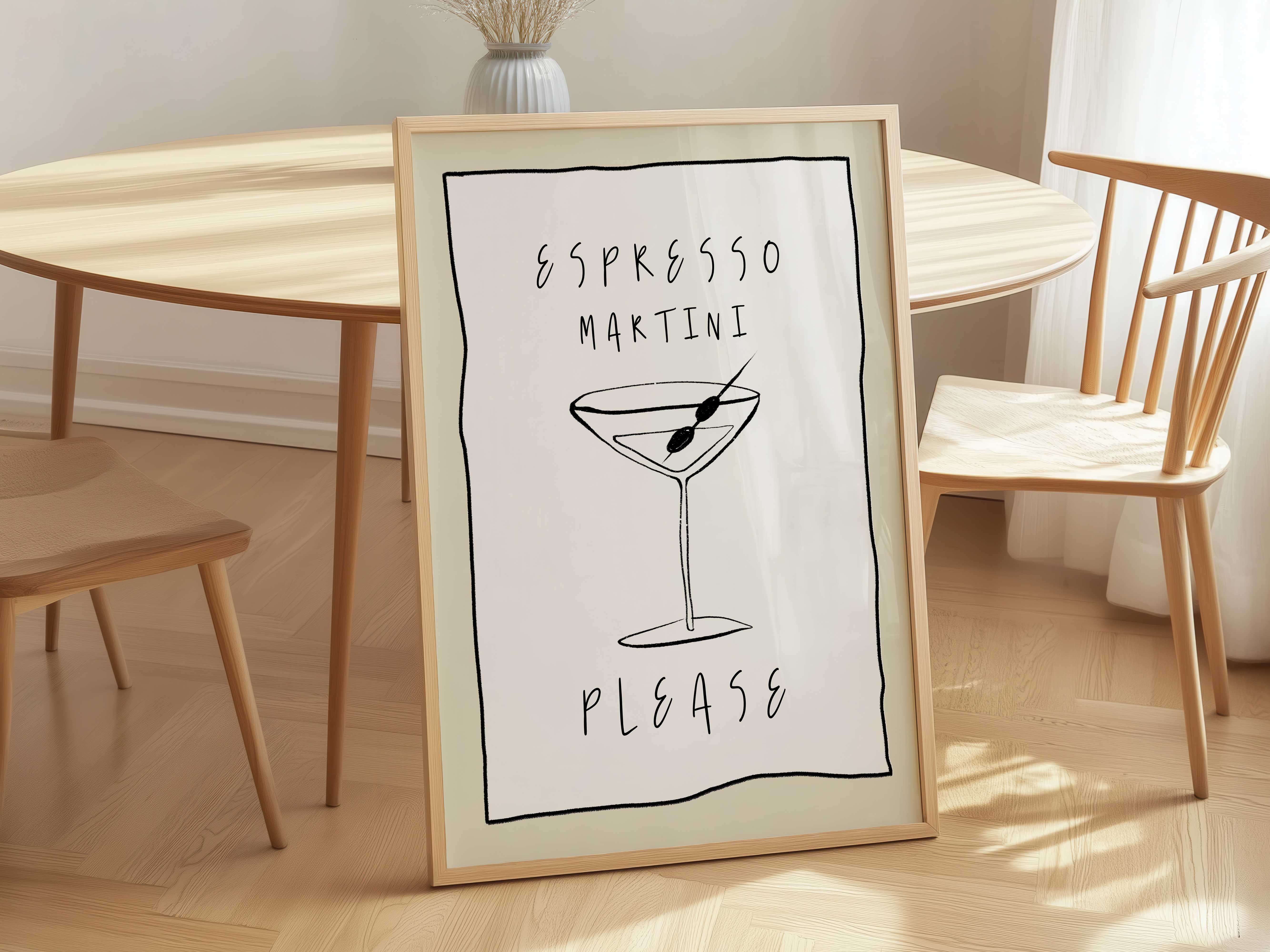 This Espresso Martini Poster features a stylish, two-tone illustration, combining beige and black for an eye-catching look that will elevate any kitchen. Hang up this tastefully designed poster and enjoy the perfect espresso martini every time.