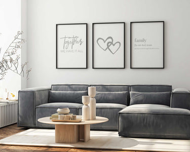 A sophisticated typographic trio celebrating family bonds. This grey-on-white print set features three complementary designs: 'Together We Have It All', 'Grey Hearts', and 'Family Noun'—each crafted to coordinate beautifully when displayed together or individually.