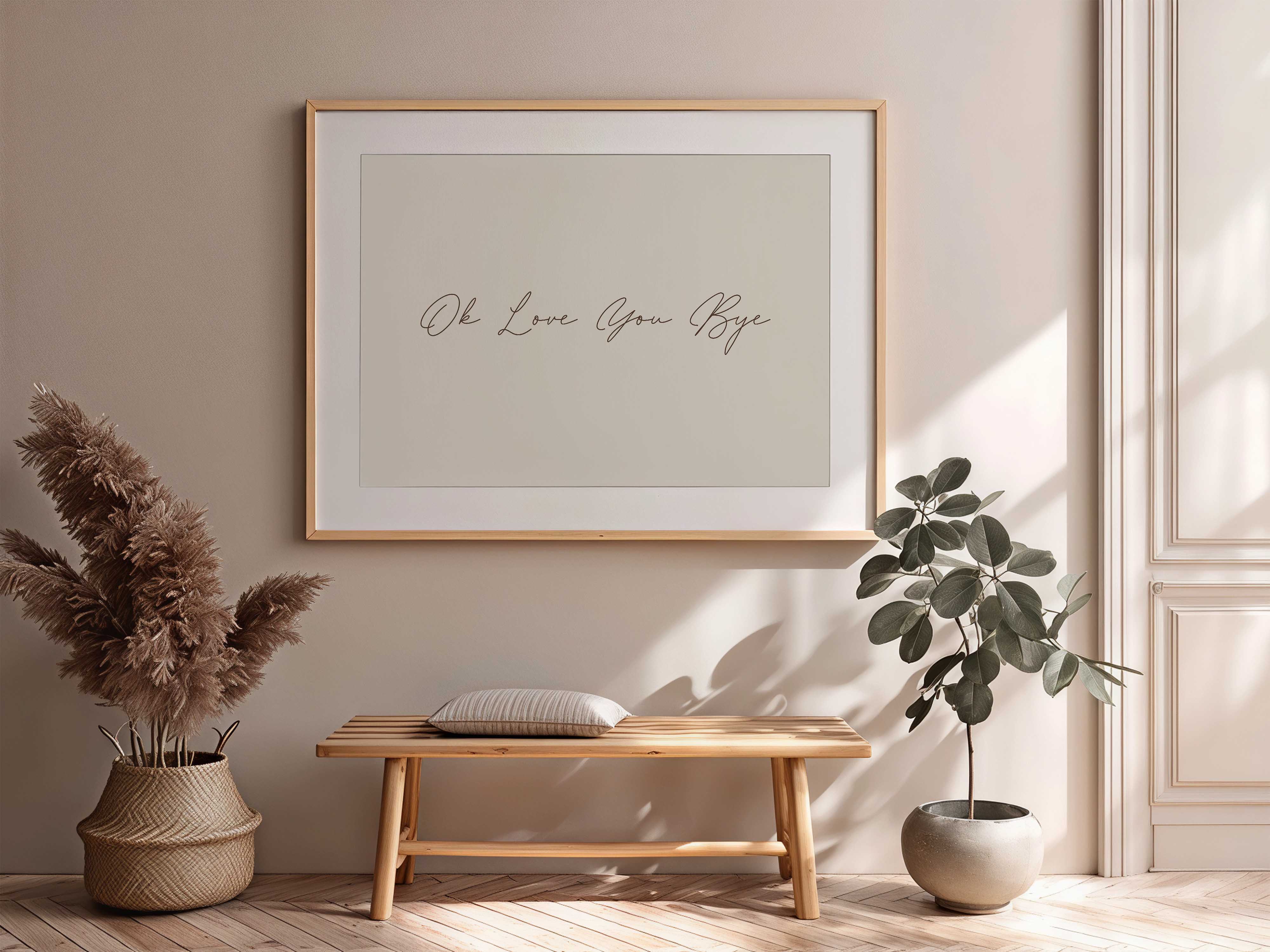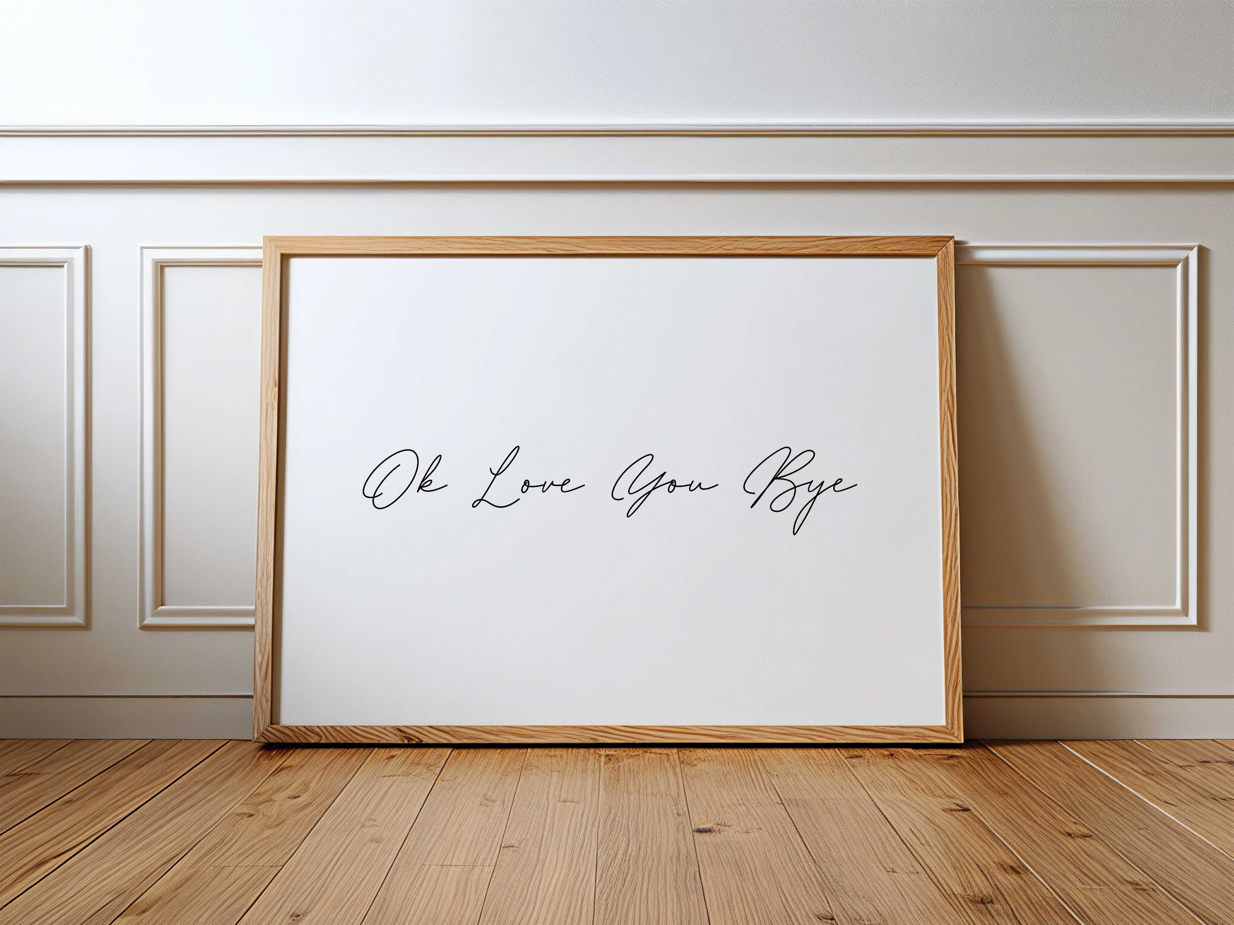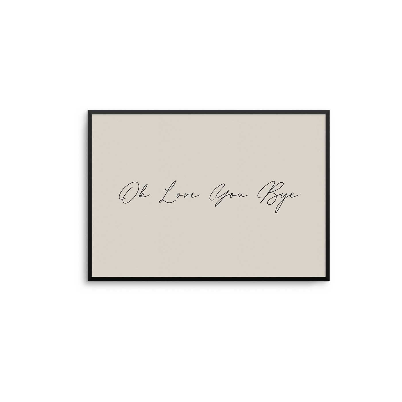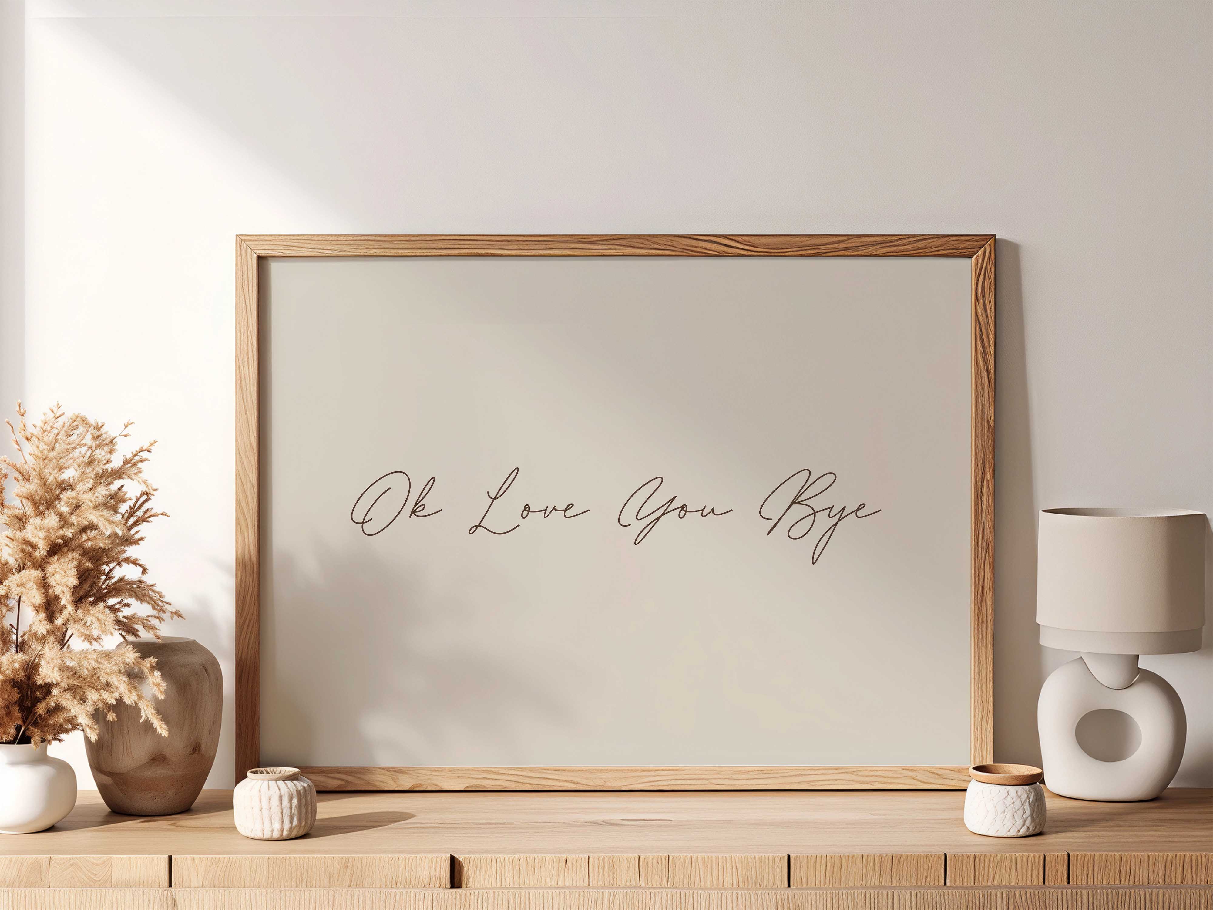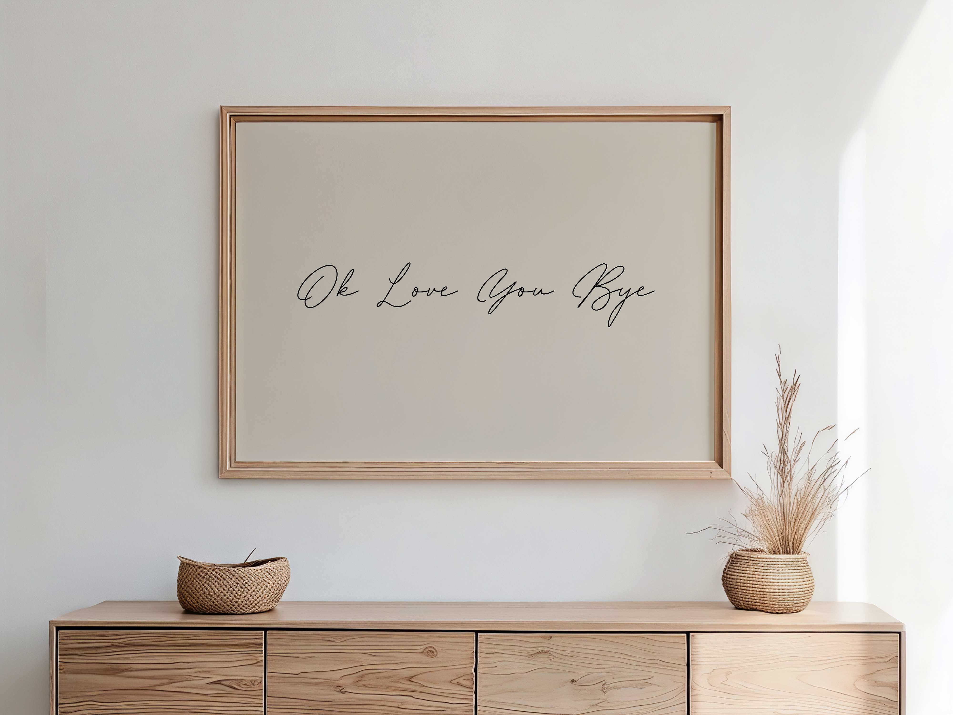 A simple, modern script print featuring the phrase “Ok Love You Bye”. Clean lettering, soft neutrals, and an easy-to-style look that works well in bedrooms, hallways, living rooms, and home offices.