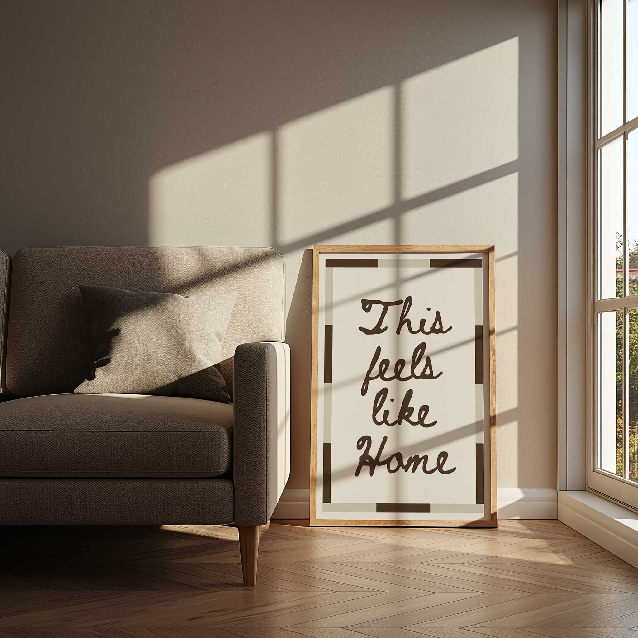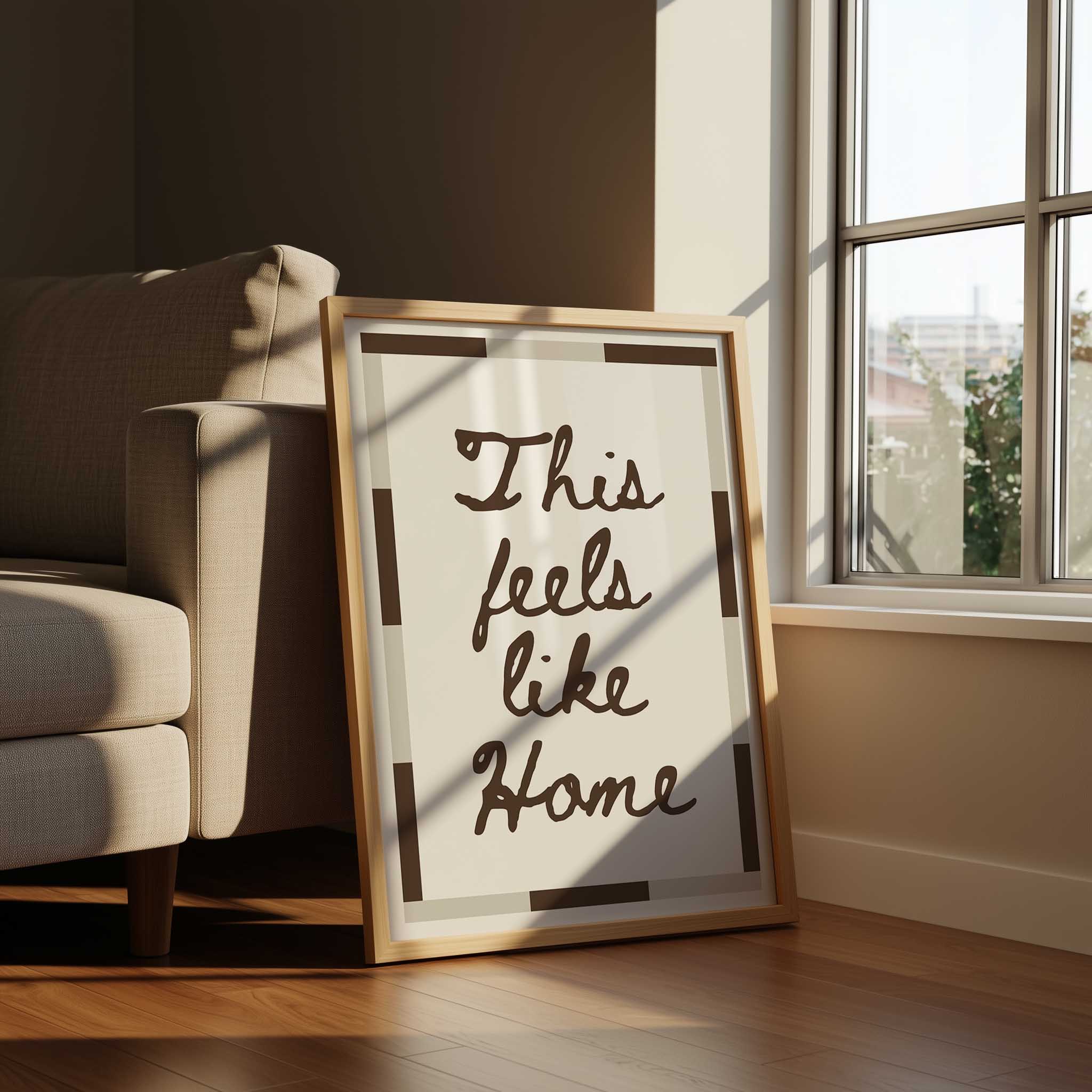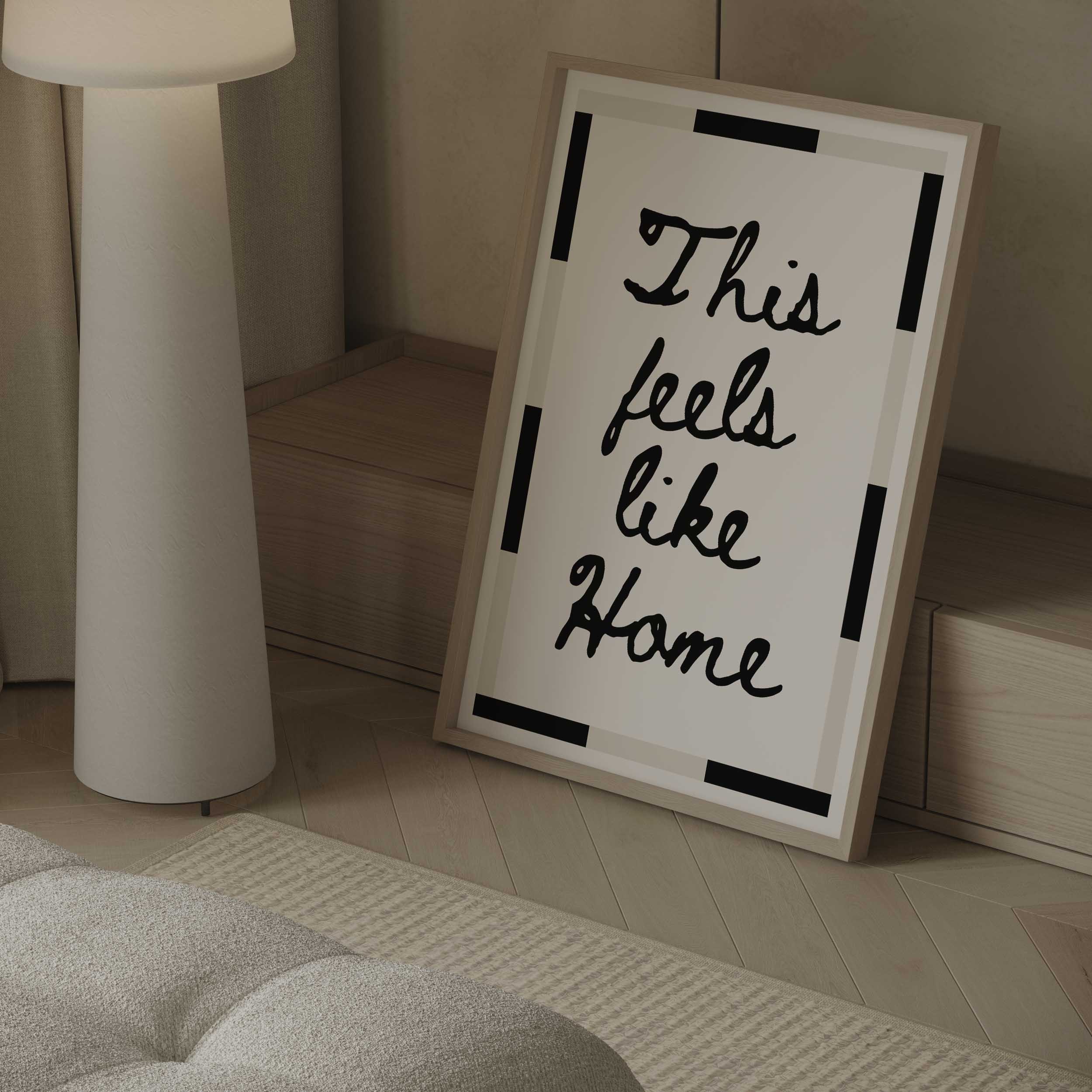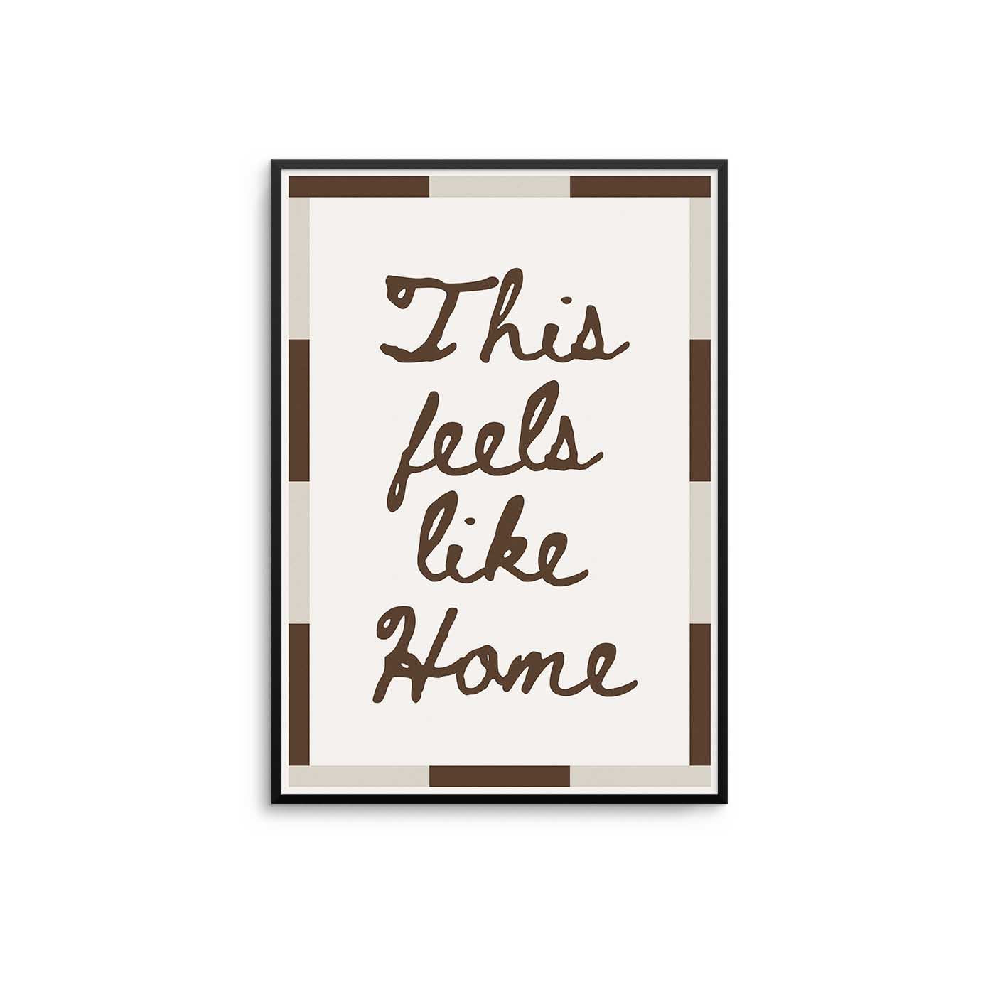 Discover the warmth of belonging with this handwritten typography print. Featuring the comforting phrase "This feels like home" in modern brown or bold black text, complemented by a geometric border, this design transforms any room into a sanctuary of calm. Ideal for living rooms, hallways, and intimate spaces, it celebrates the essence of home and connection.