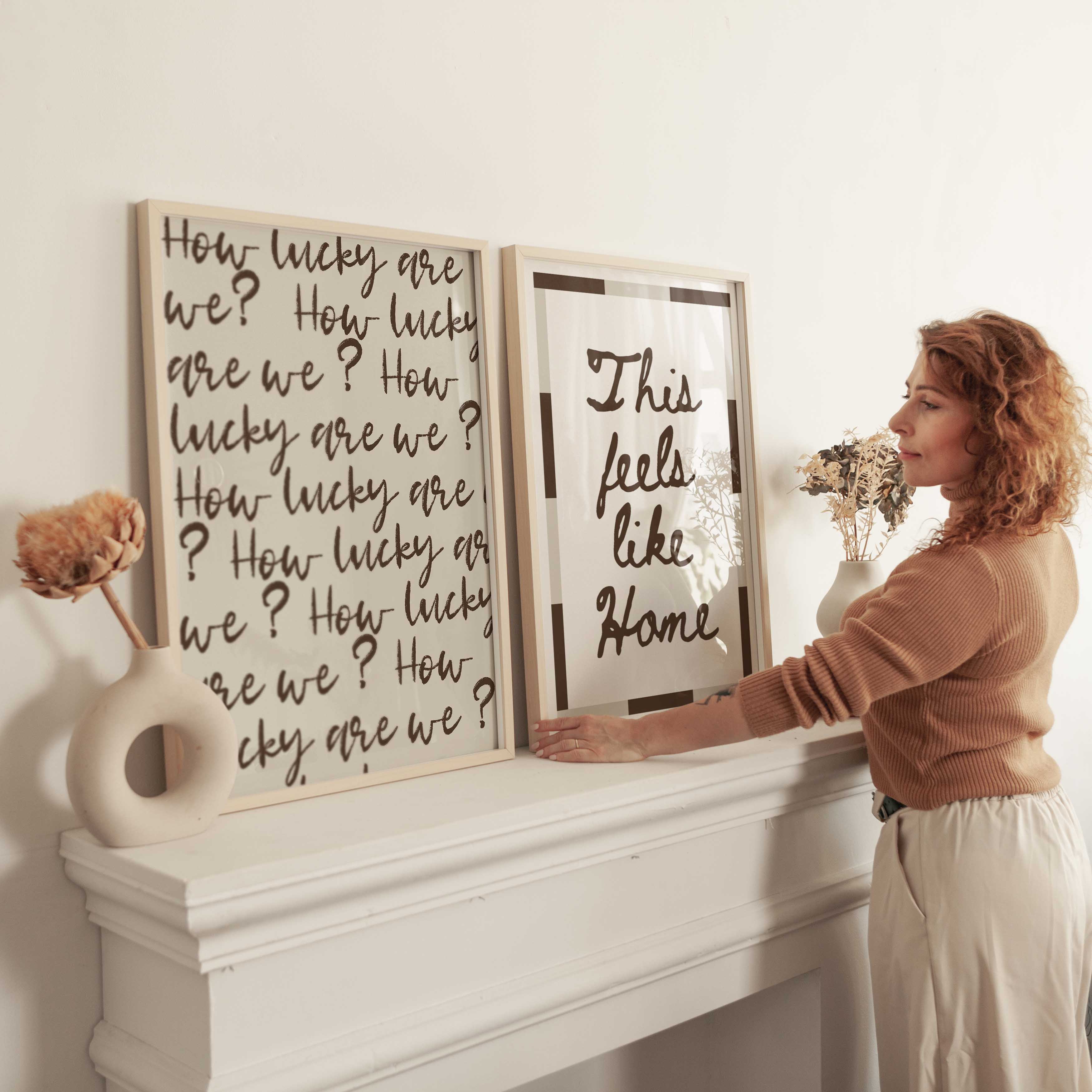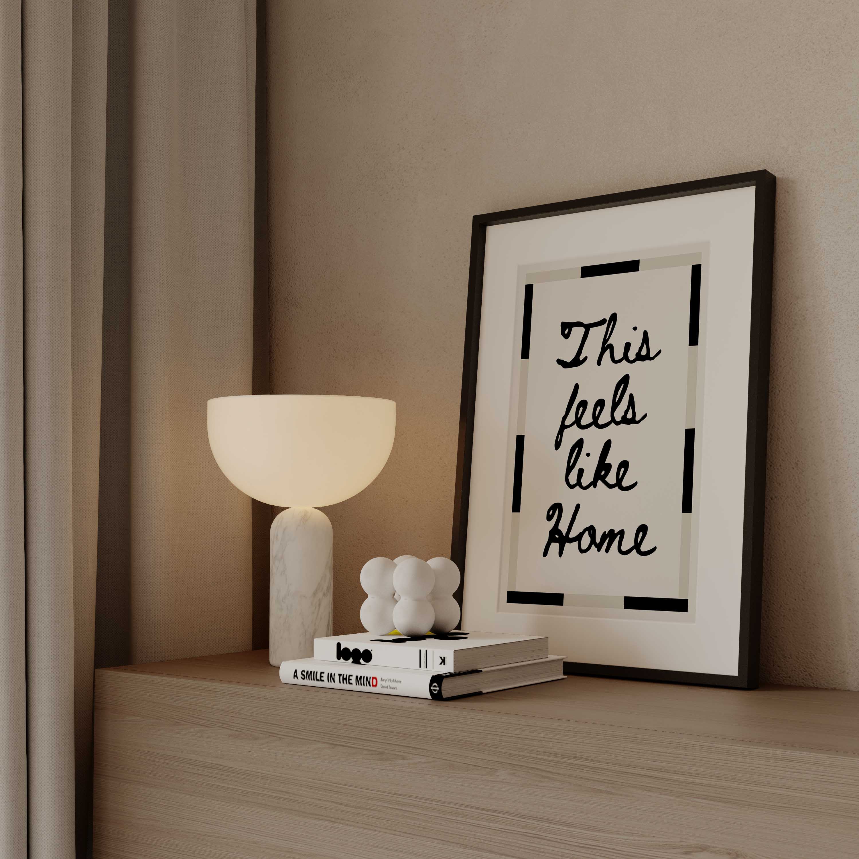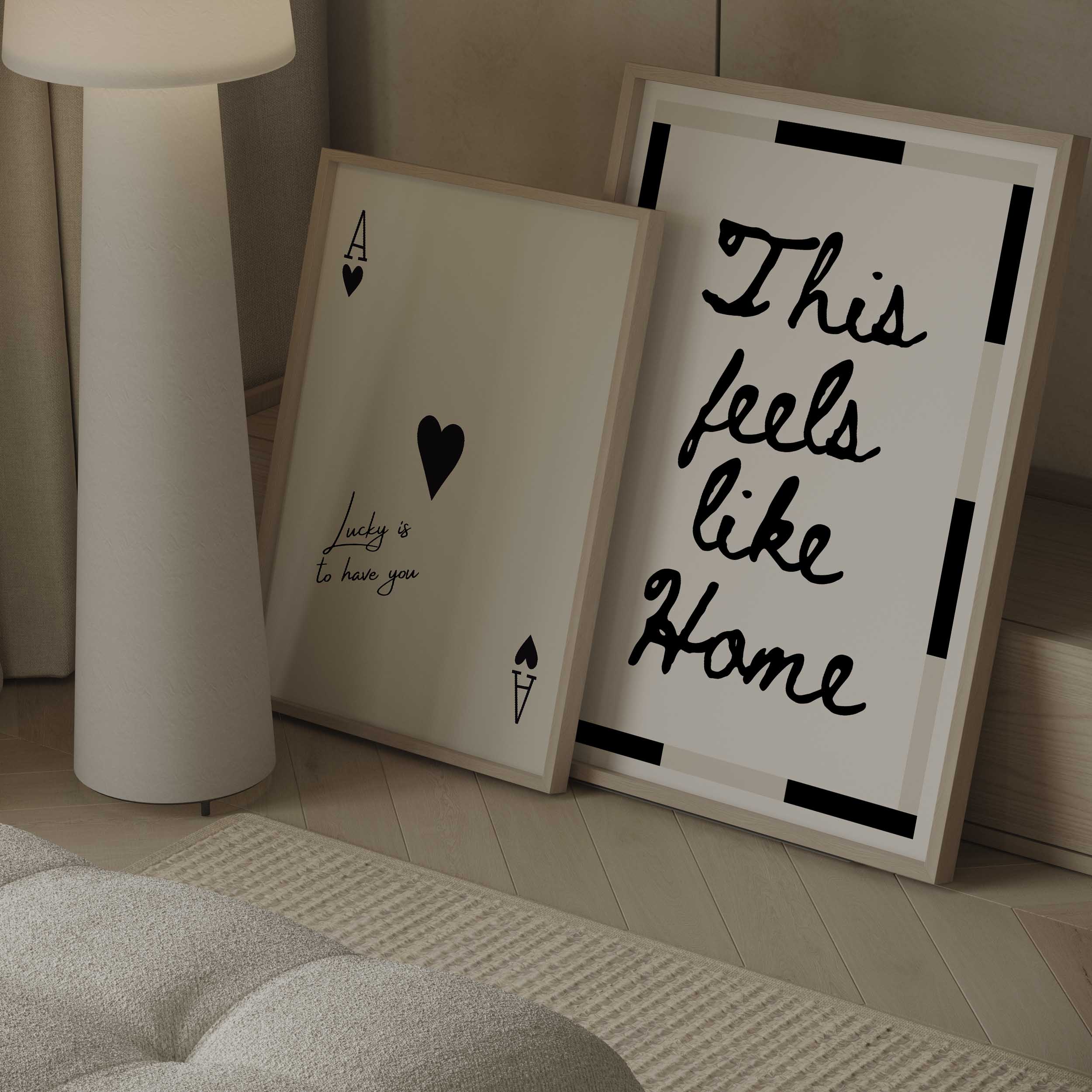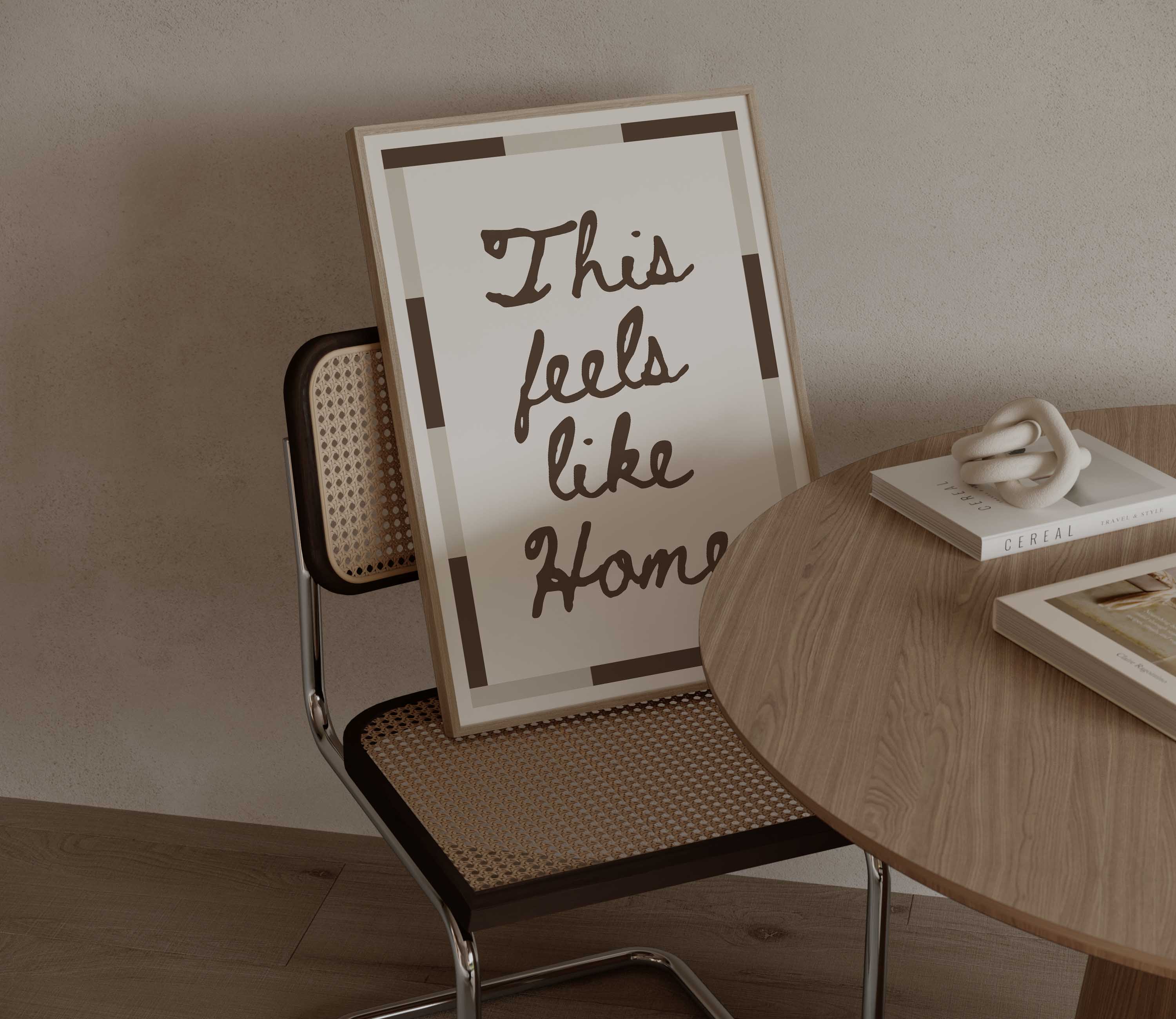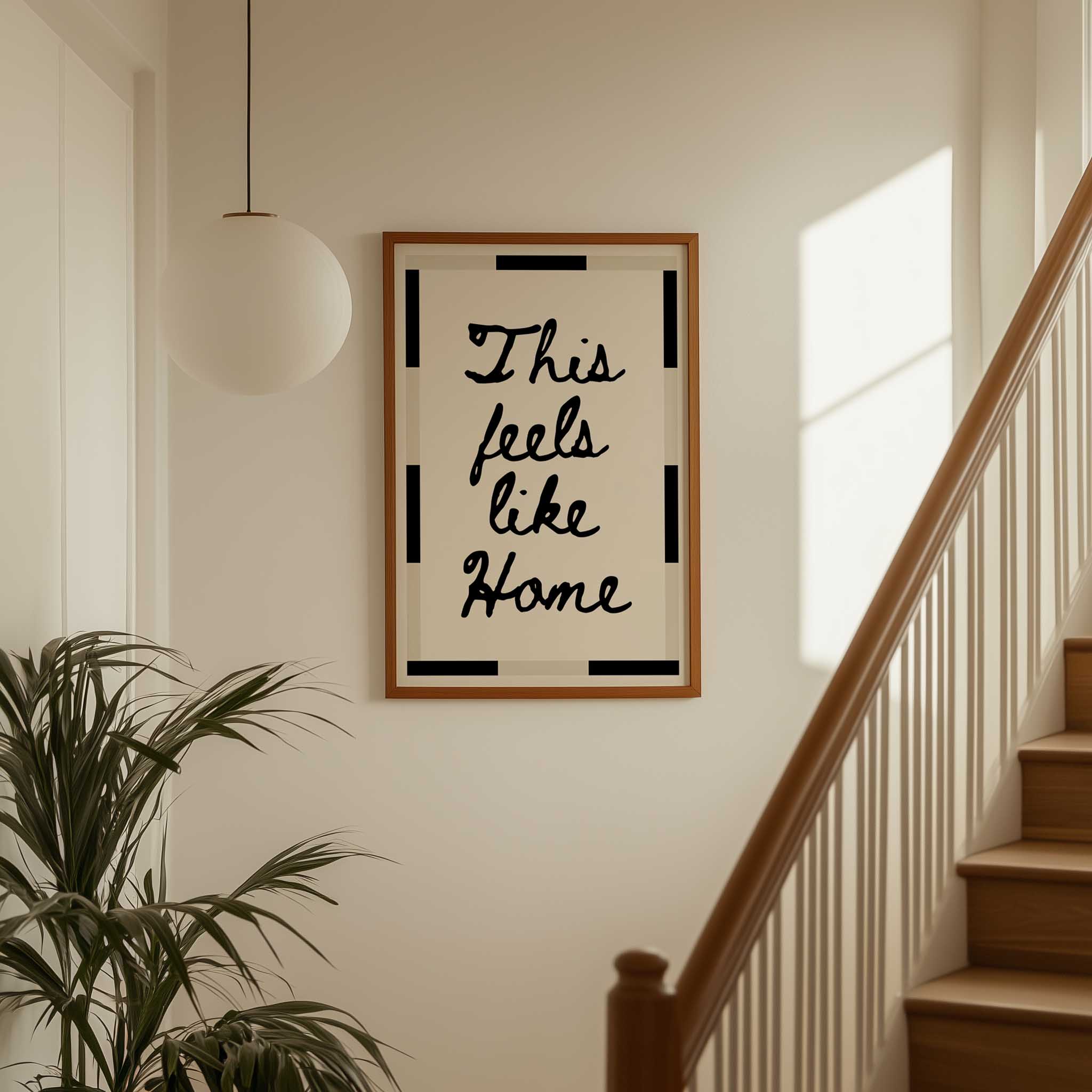 Discover the warmth of belonging with this handwritten typography print. Featuring the comforting phrase "This feels like home" in modern brown or bold black text, complemented by a geometric border, this design transforms any room into a sanctuary of calm. Ideal for living rooms, hallways, and intimate spaces, it celebrates the essence of home and connection.