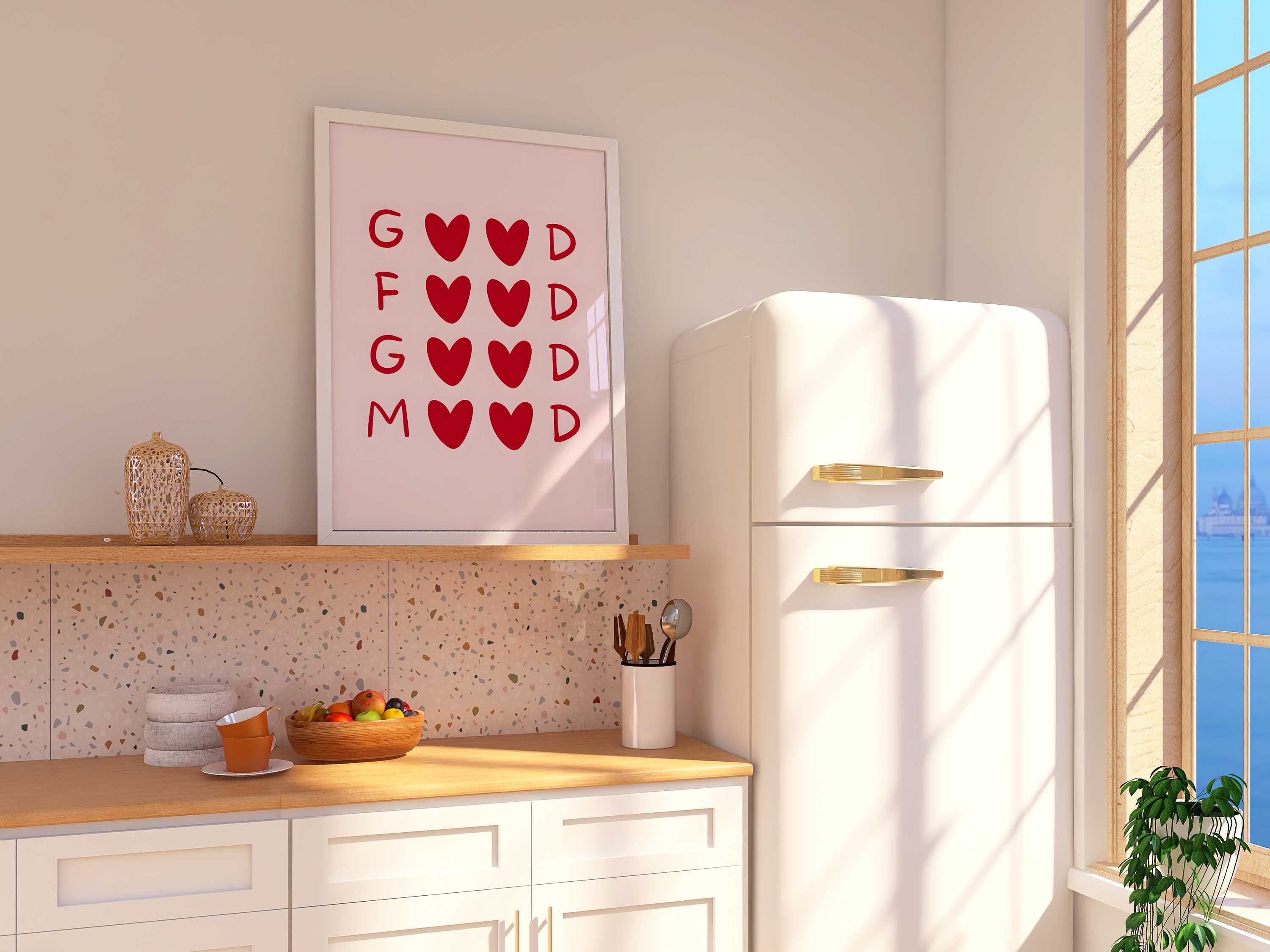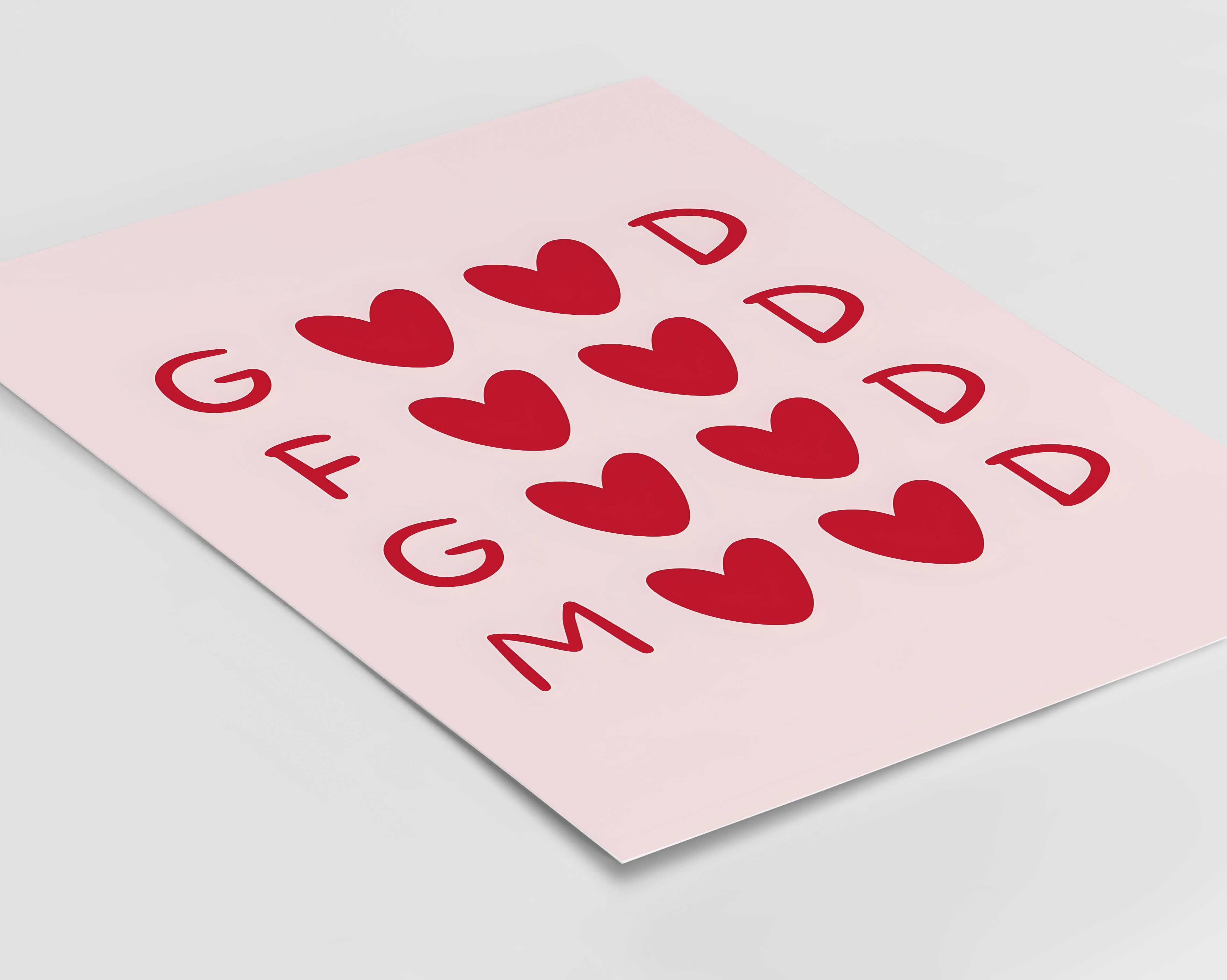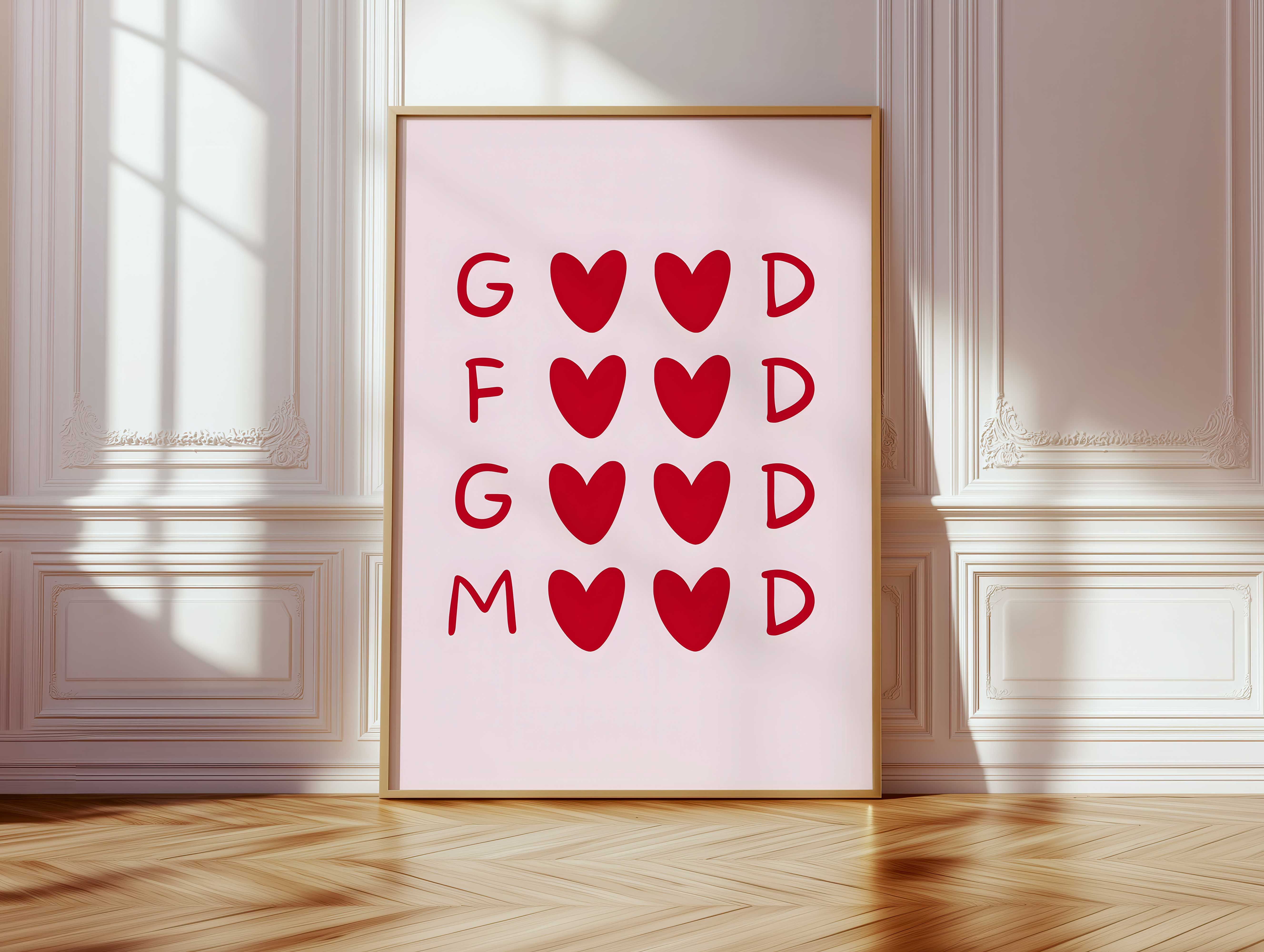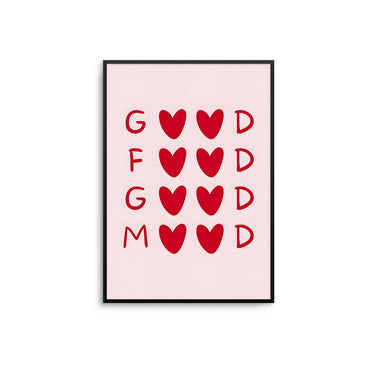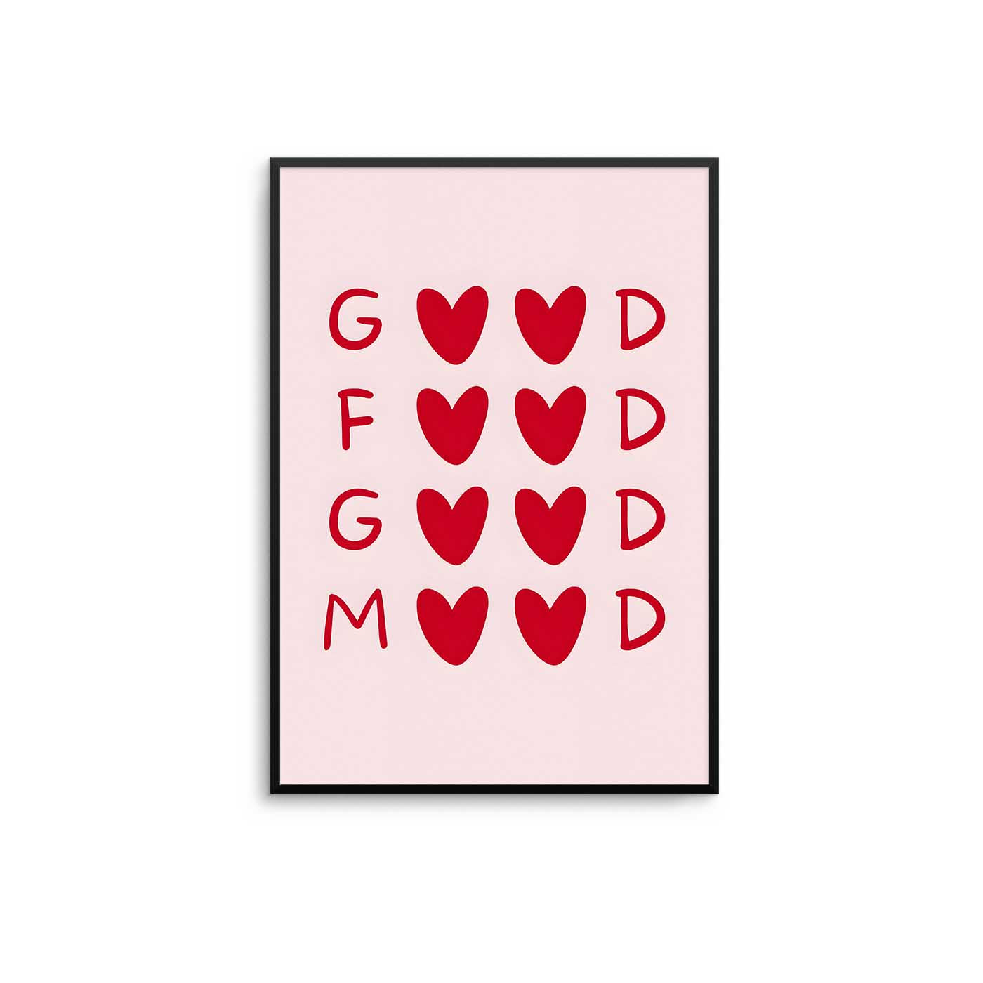 This poster features the phrase "good food good mood" in striking red lettering on a pink backdrop. Its lively and cheerful design makes it an ideal decorative piece for your kitchen or dining space.