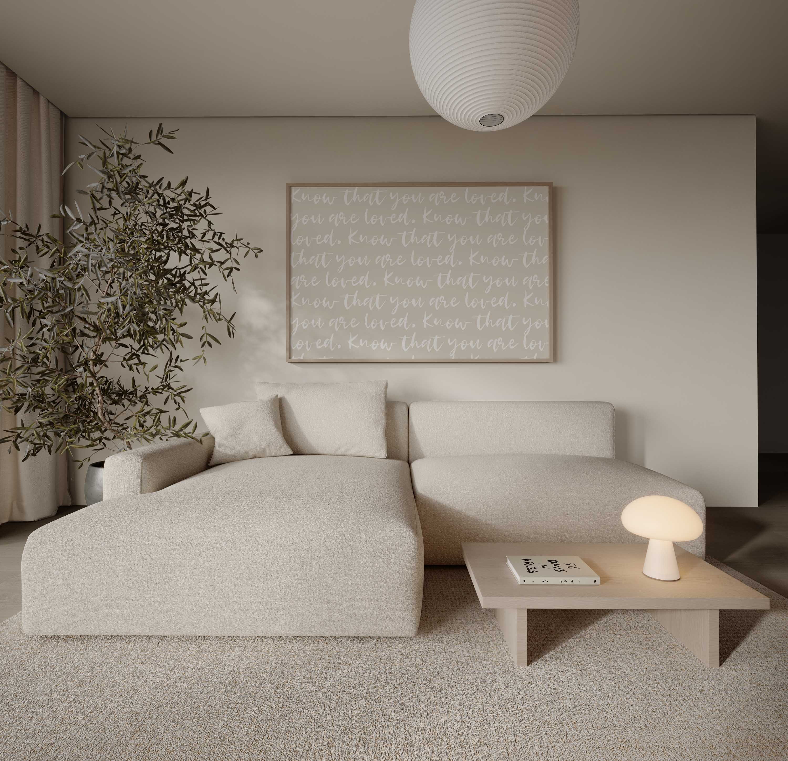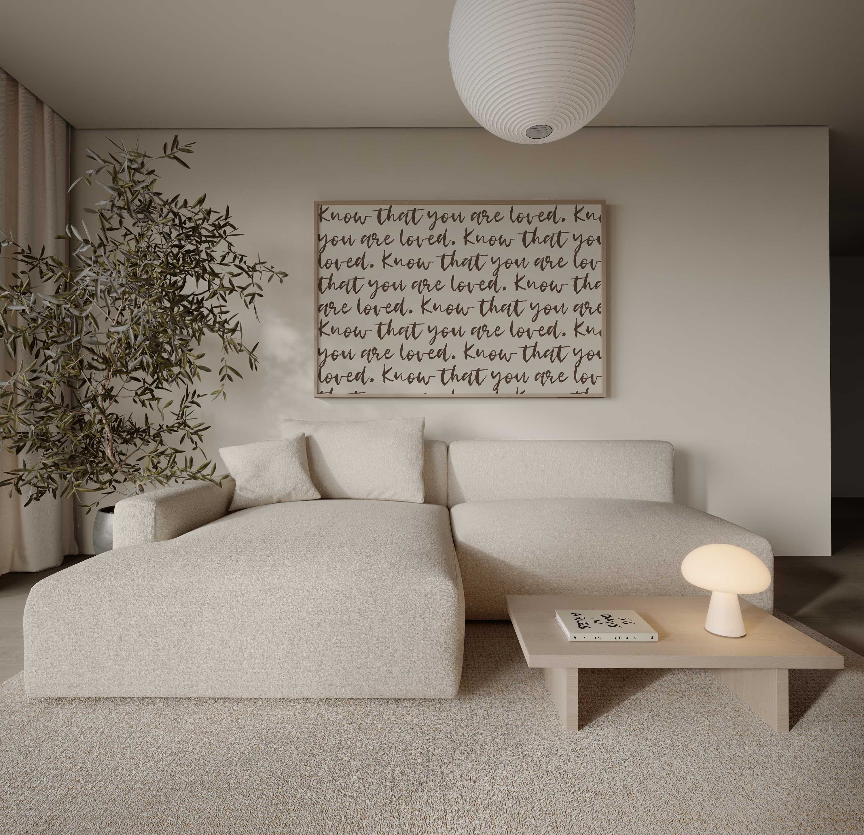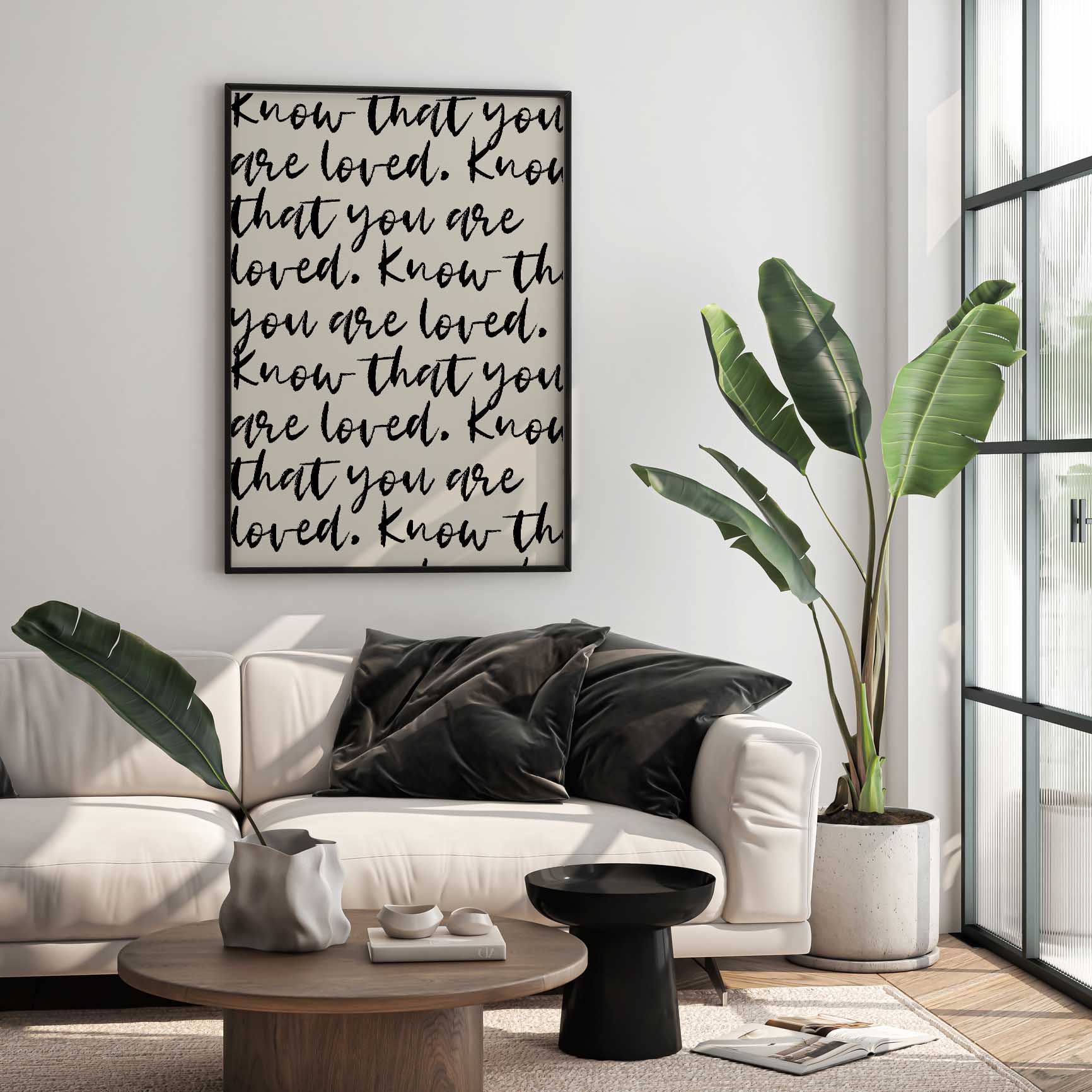 This repeating script typography print centres on a simple, reassuring message, layered in an expressive handwritten style. The all-over text creates visual texture while keeping a calm, familiar feel that works beautifully in real homes.