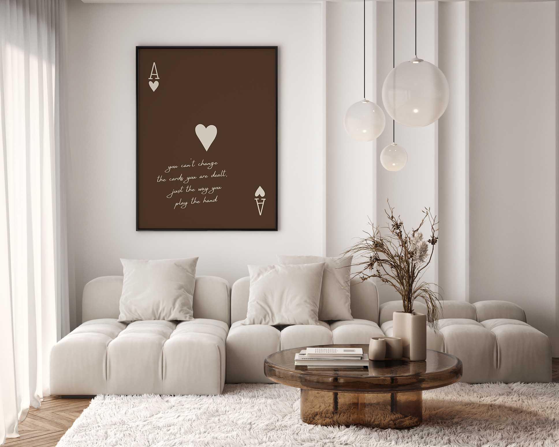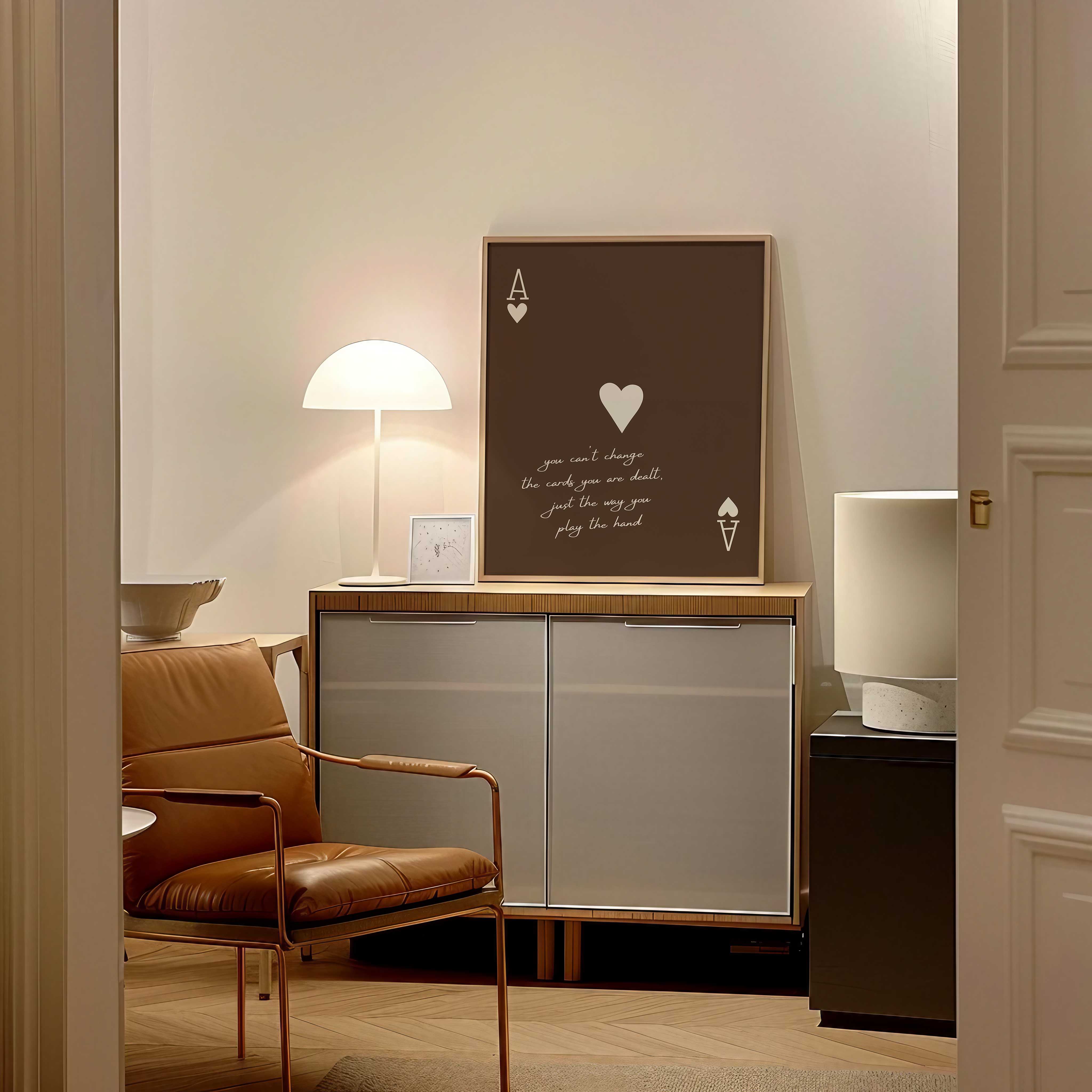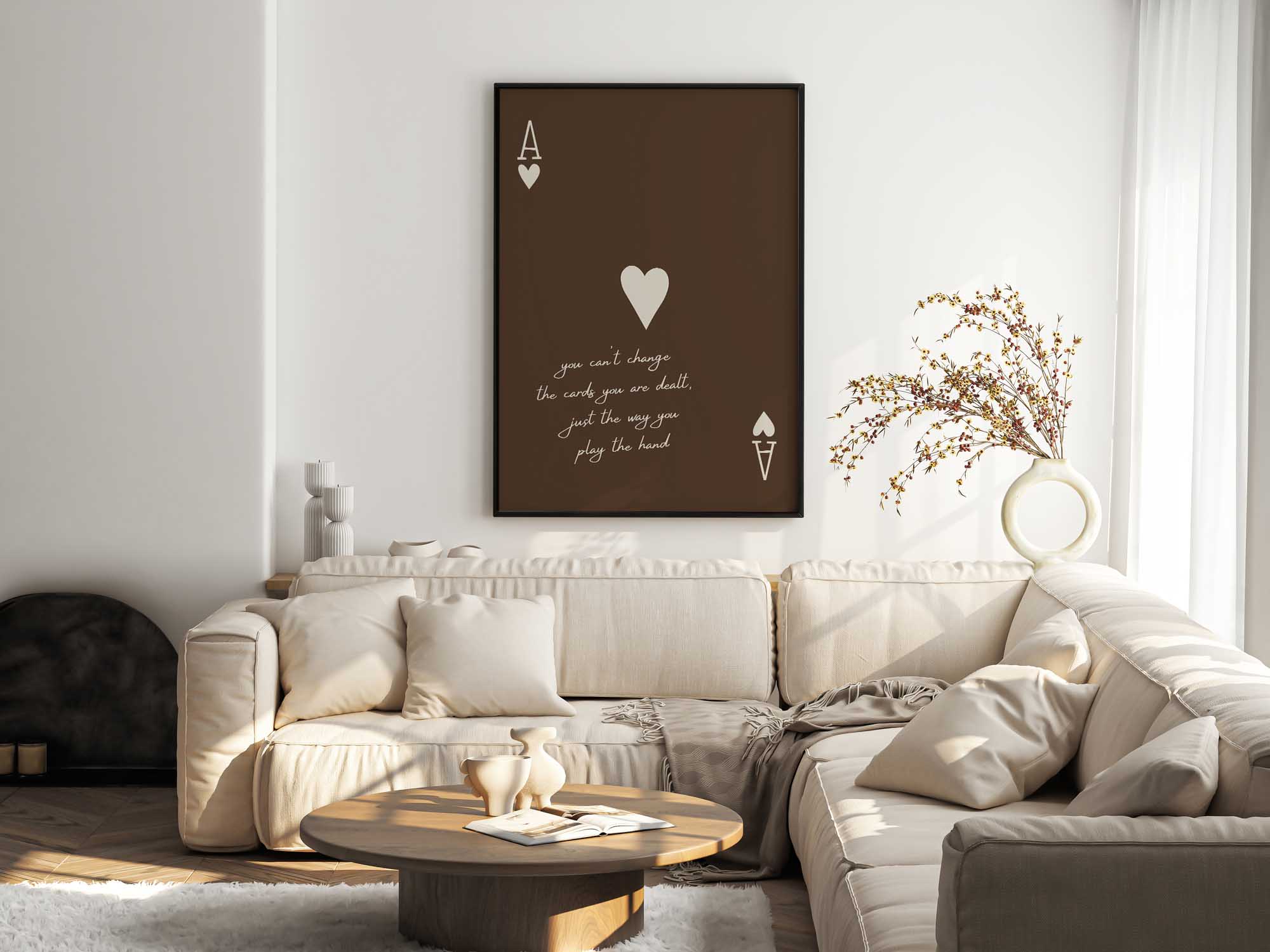A minimal playing-card inspired art print designed in a warm, earthy brown tone with soft beige text.
