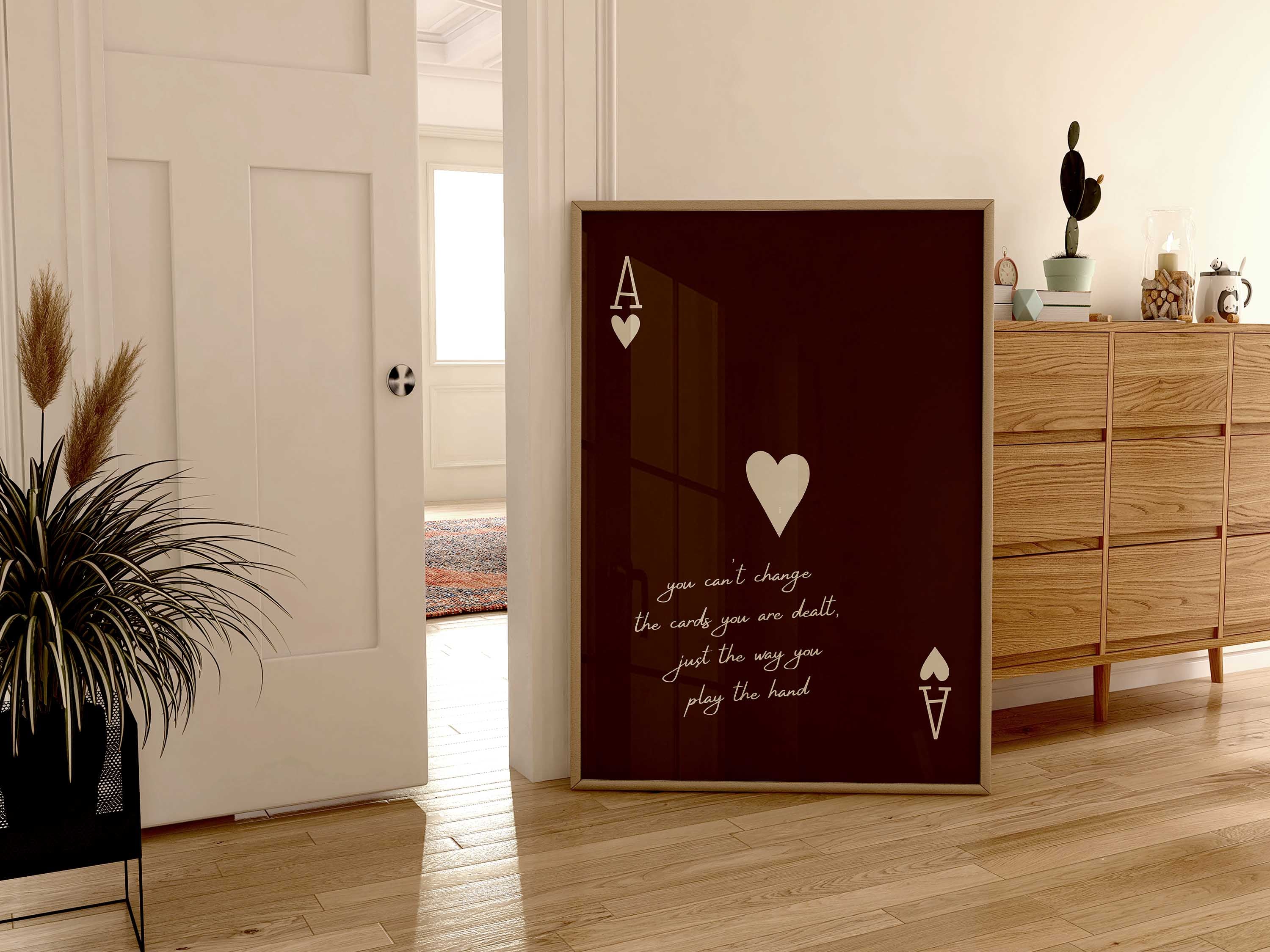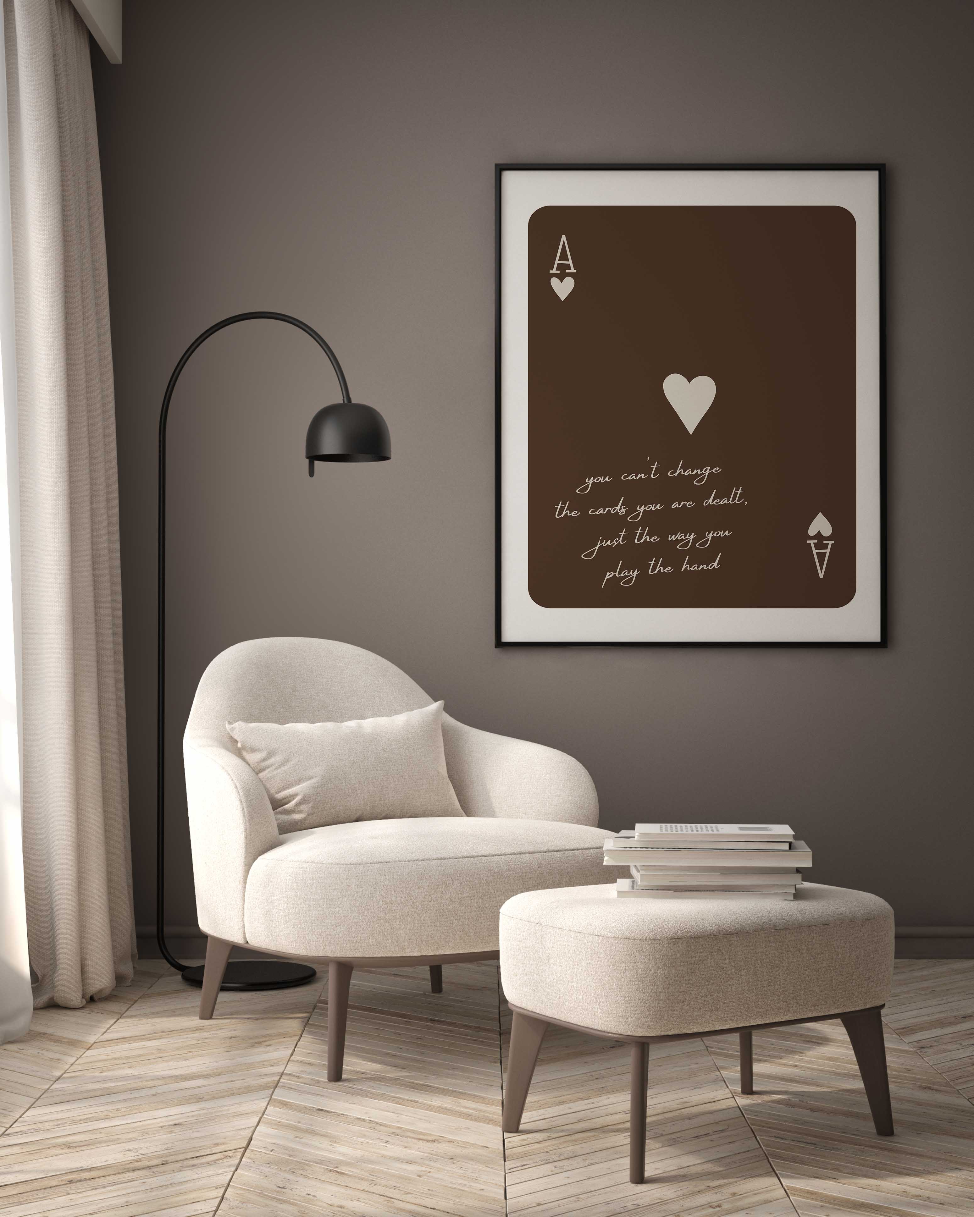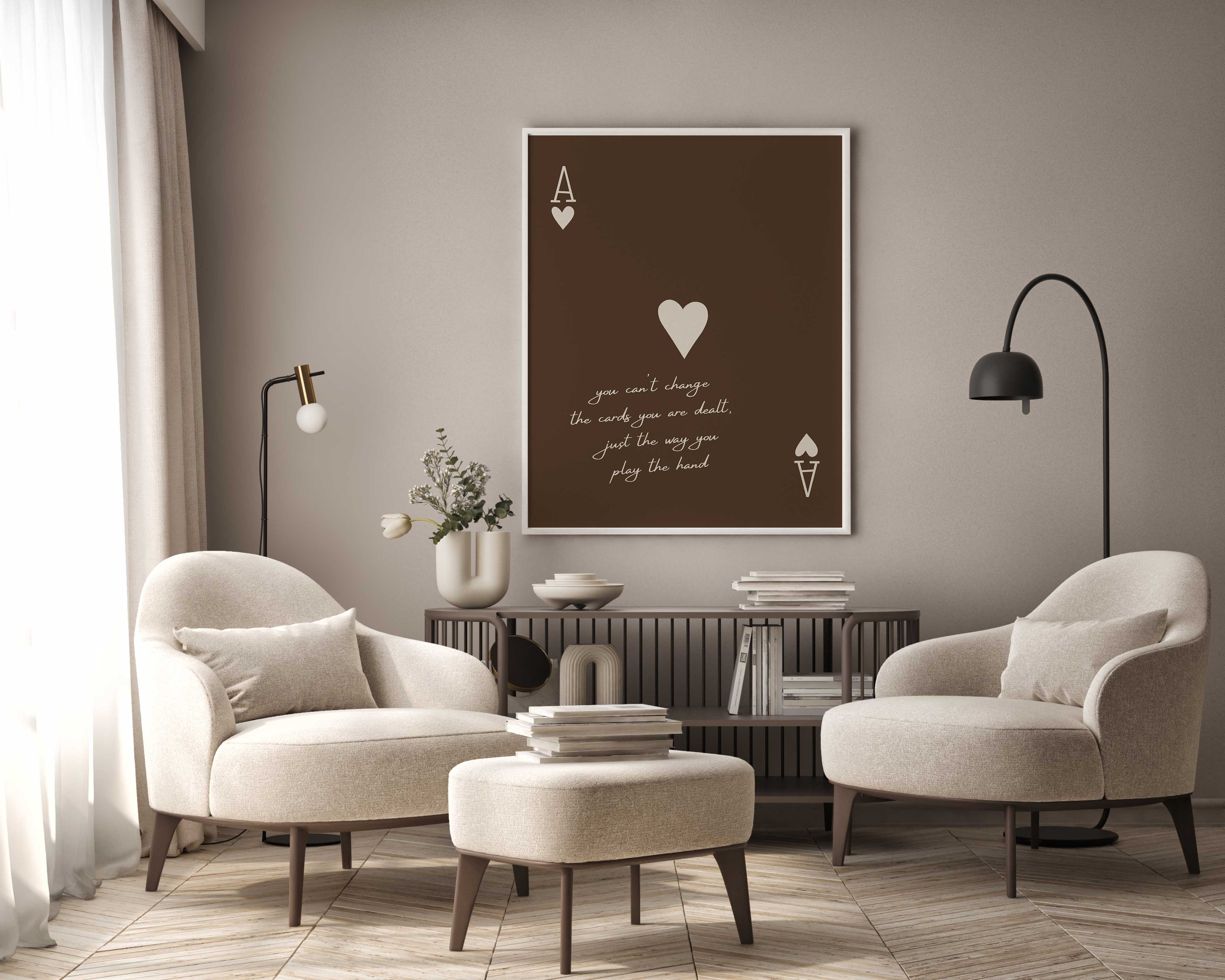 A minimal playing-card inspired art print designed in a warm, earthy brown tone with soft beige text.