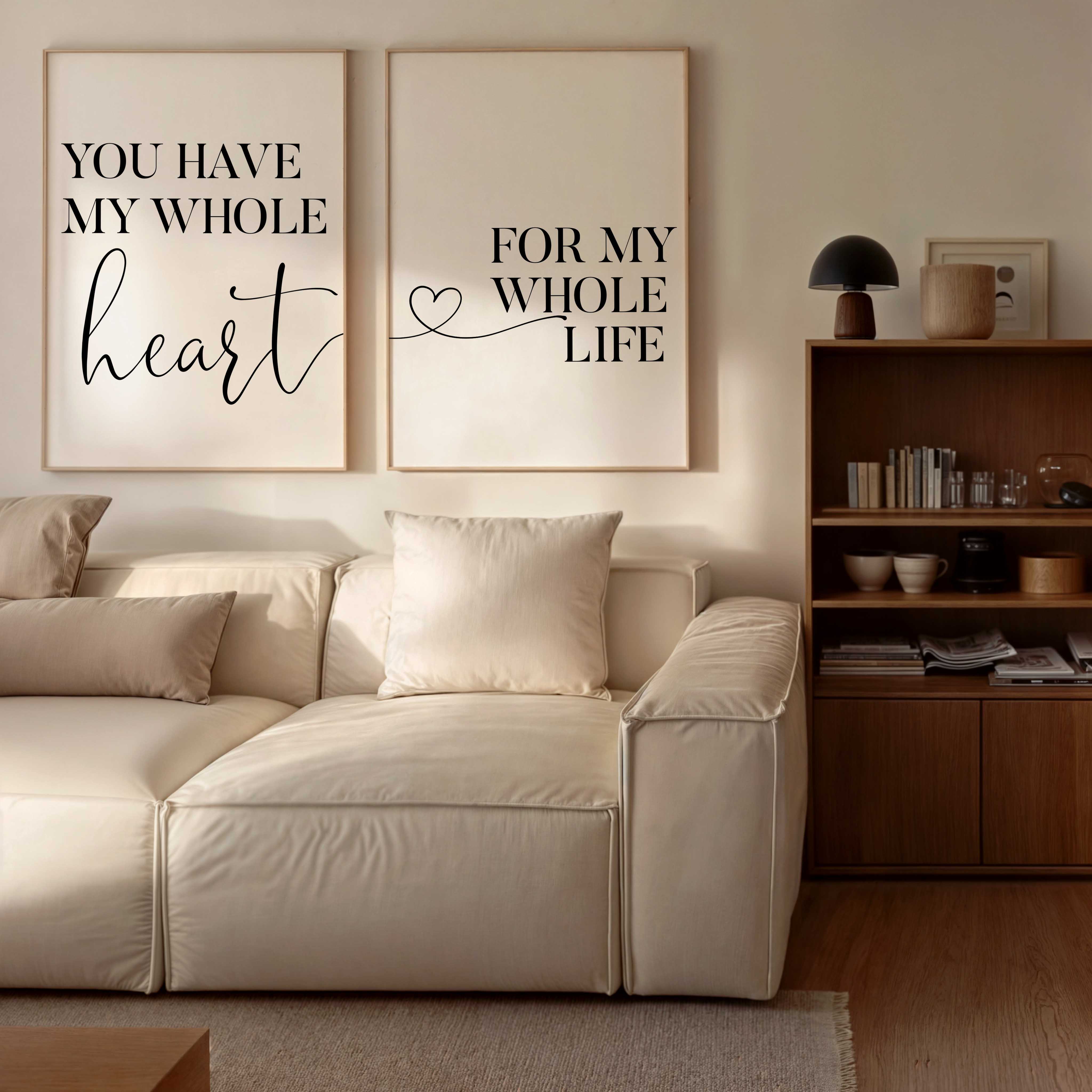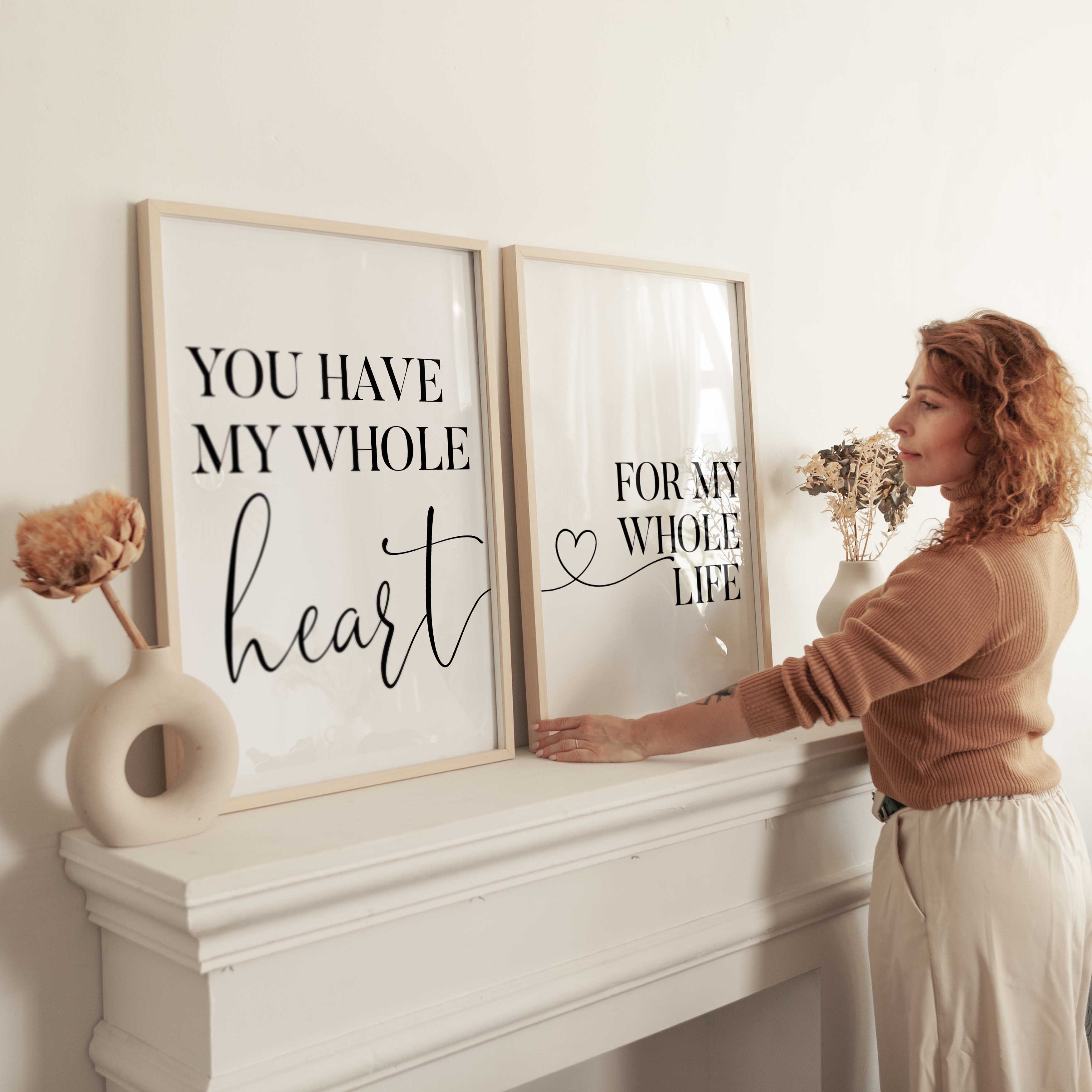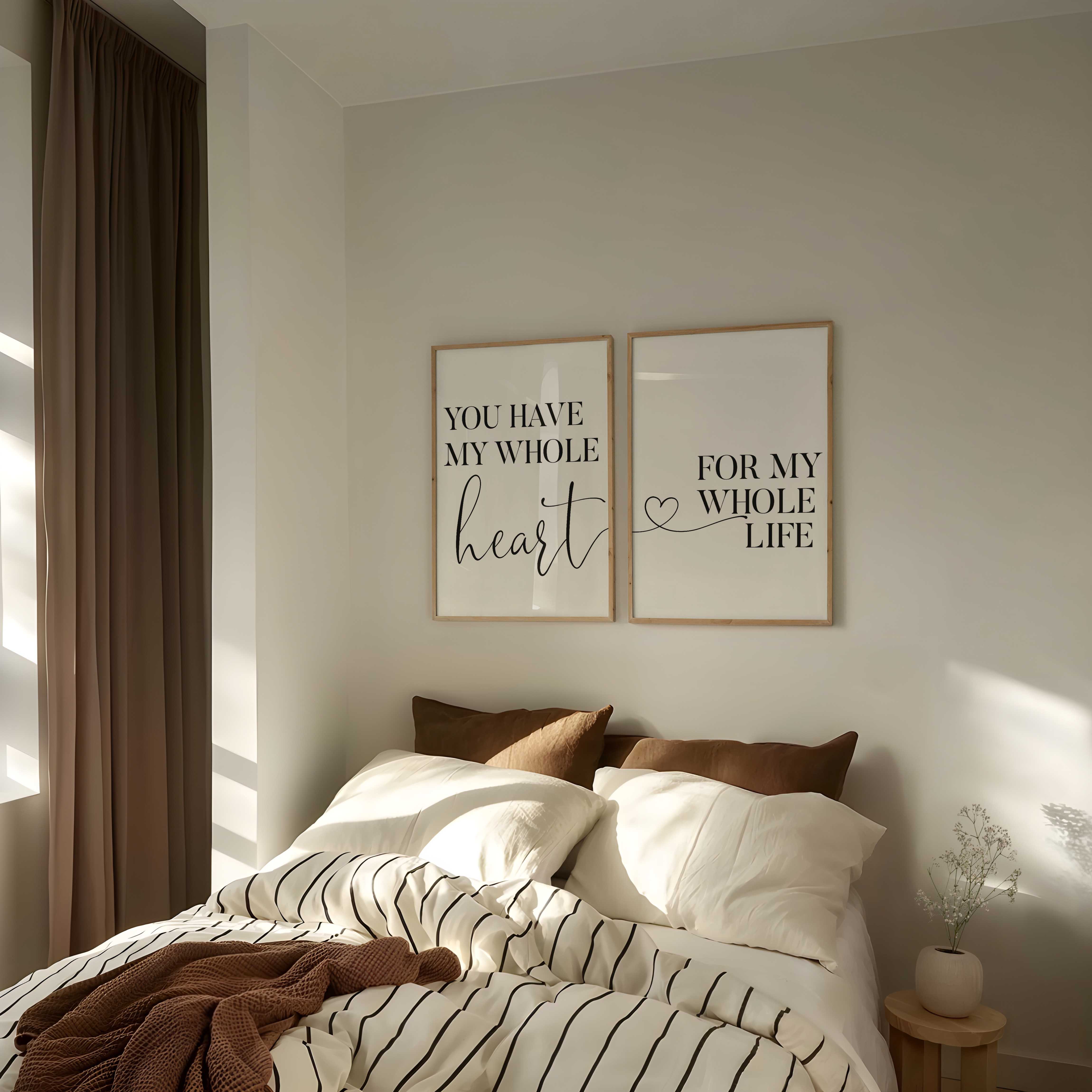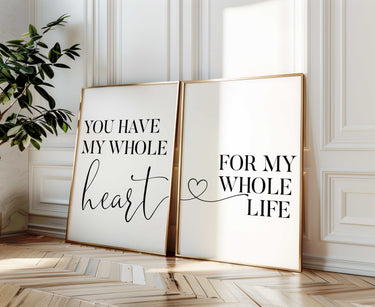 This set includes two prints displaying the phrase 'You Have My Whole Heart For My Whole Life' in elegant black typography, offering a sophisticated and heartfelt addition to bedroom decor.