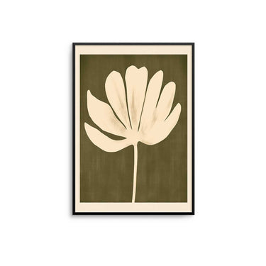 The beige leaf poster showcases a beige leaf illustration on an olive background with a beige border. It is a dynamic and eye-catching print that brings warmth and boldness to any neutral-toned space.