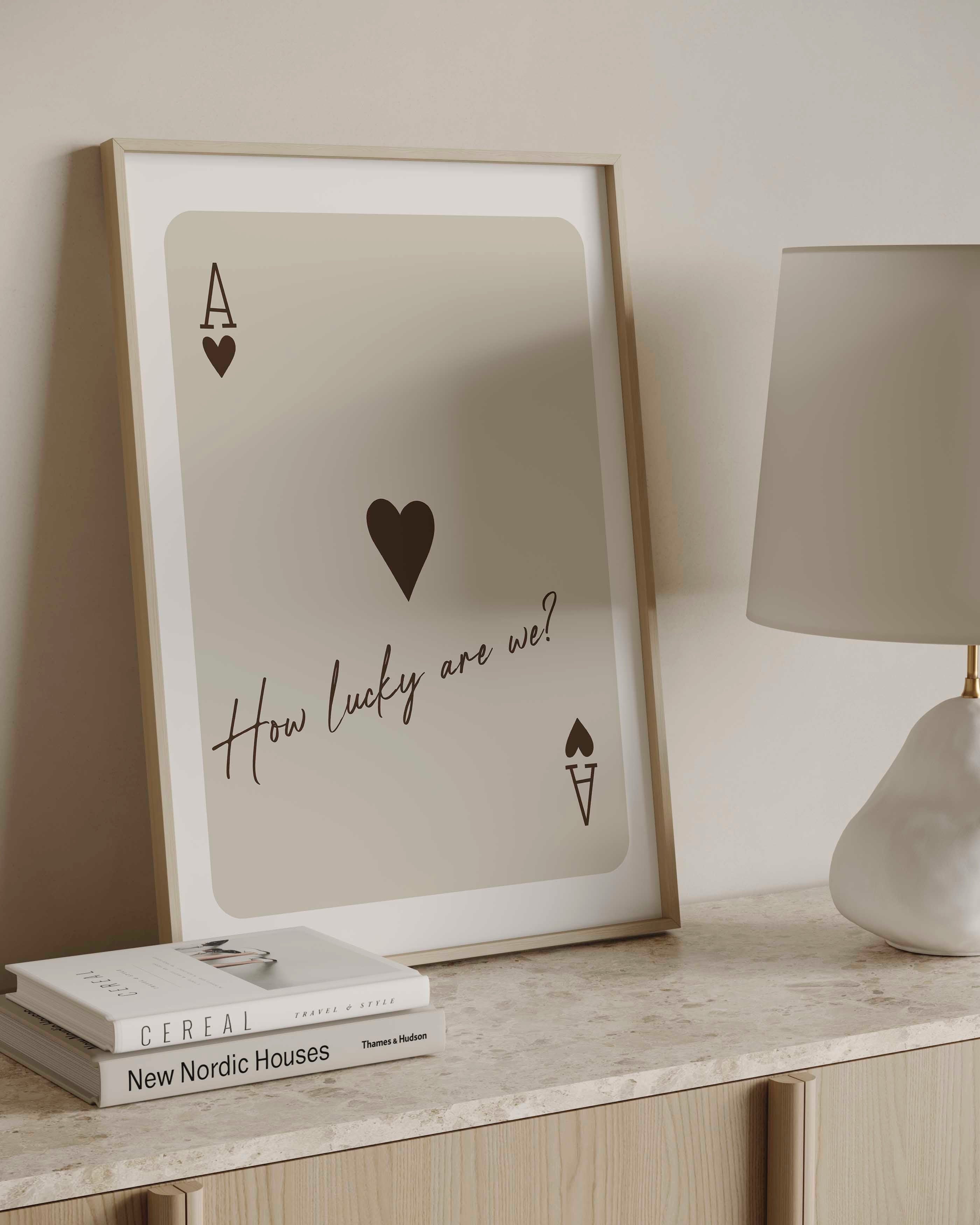 This poster features a powerful quote asking 'How lucky are we? The bold black or warm brown font stands out against a neutral beige background and is framed by a crisp white border, or you can choose to have the print borderless, making it a perfect addition to any living space.