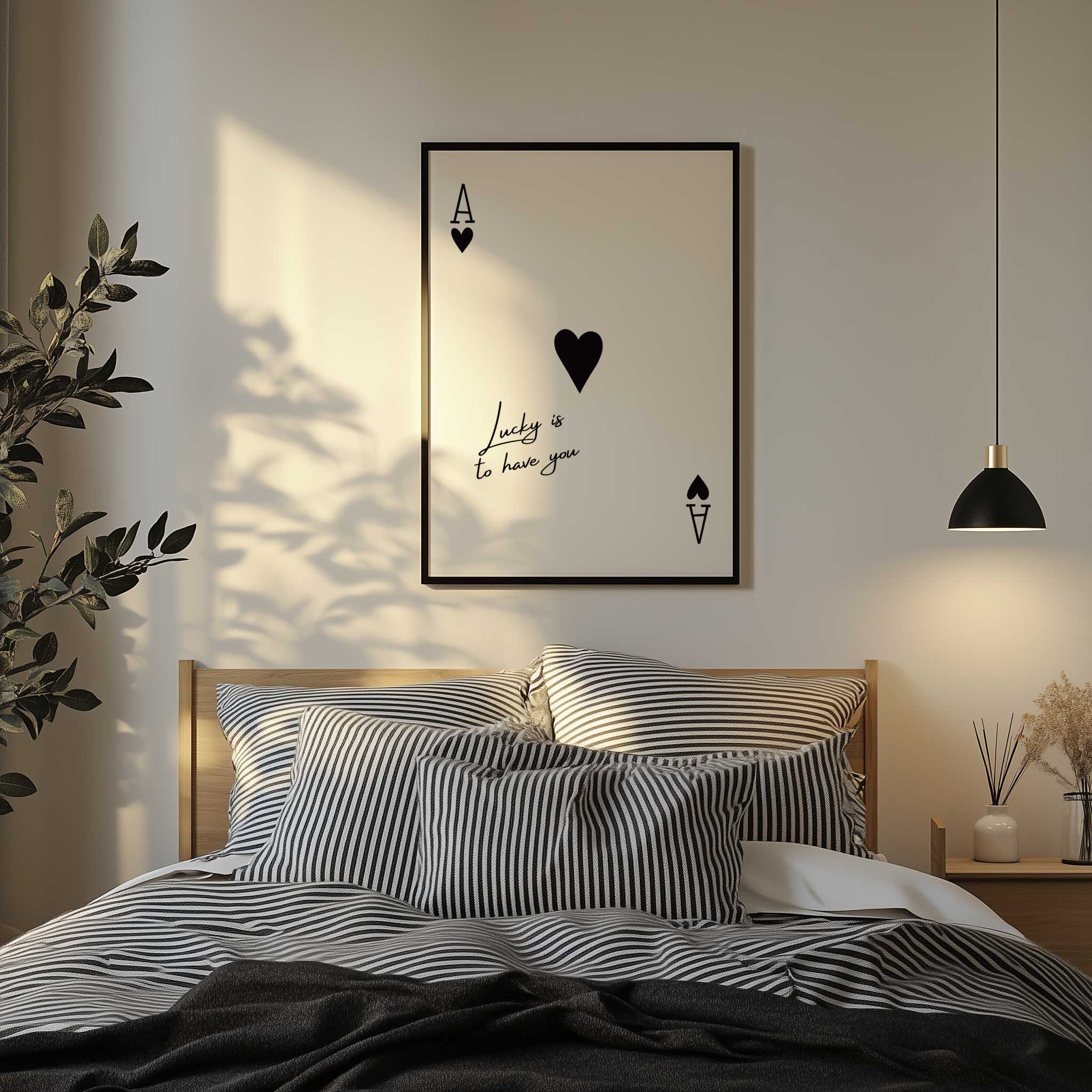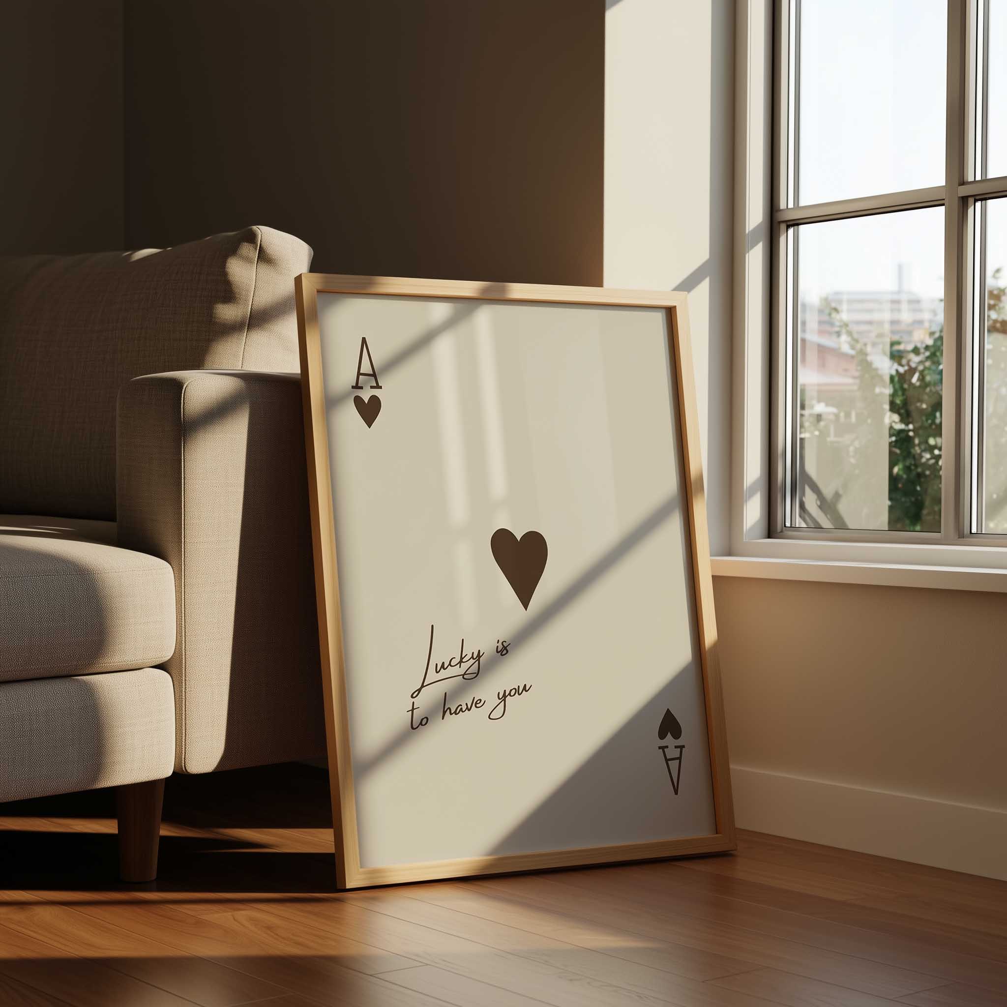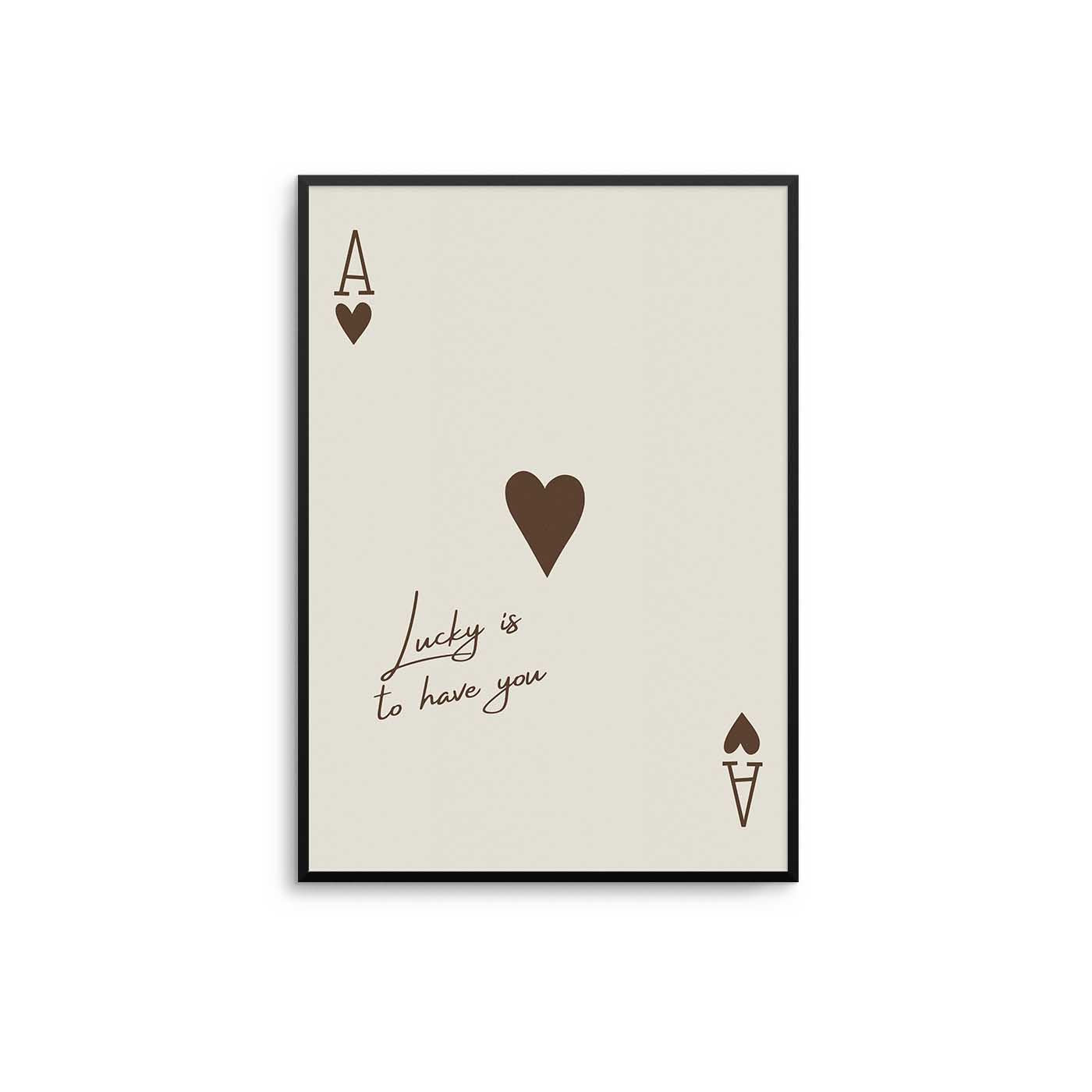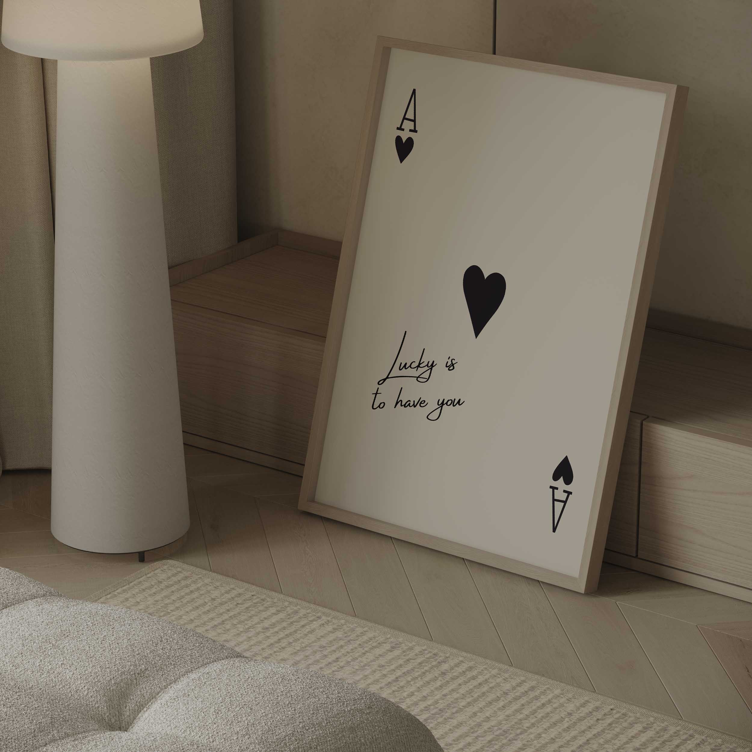 The Lucky Is To Have You – Ace of Hearts Print combines a classic card motif with expressive script typography, creating a design that feels both playful and considered. The balance between the bold card symbol and delicate handwritten text brings warmth and character to modern interiors.
