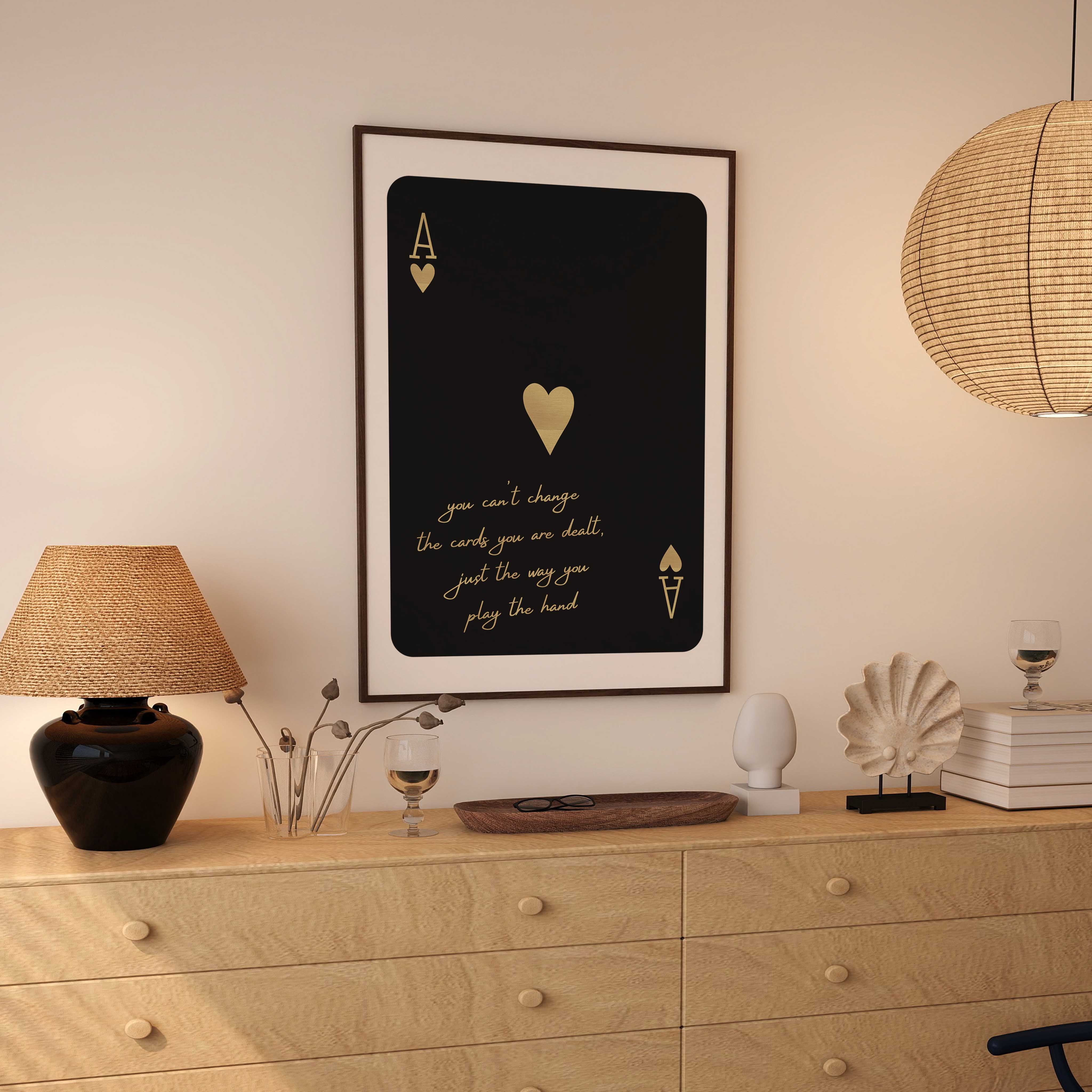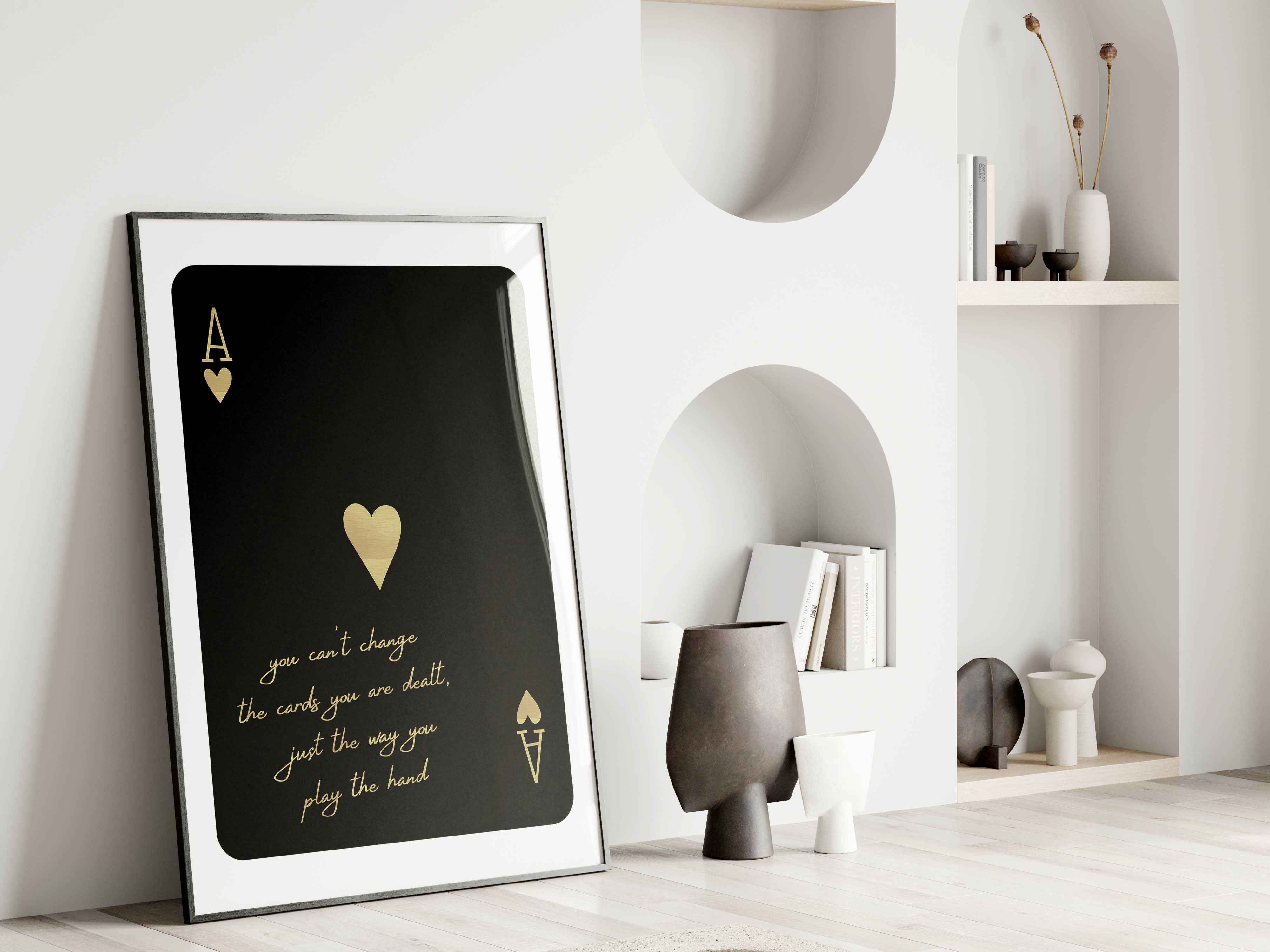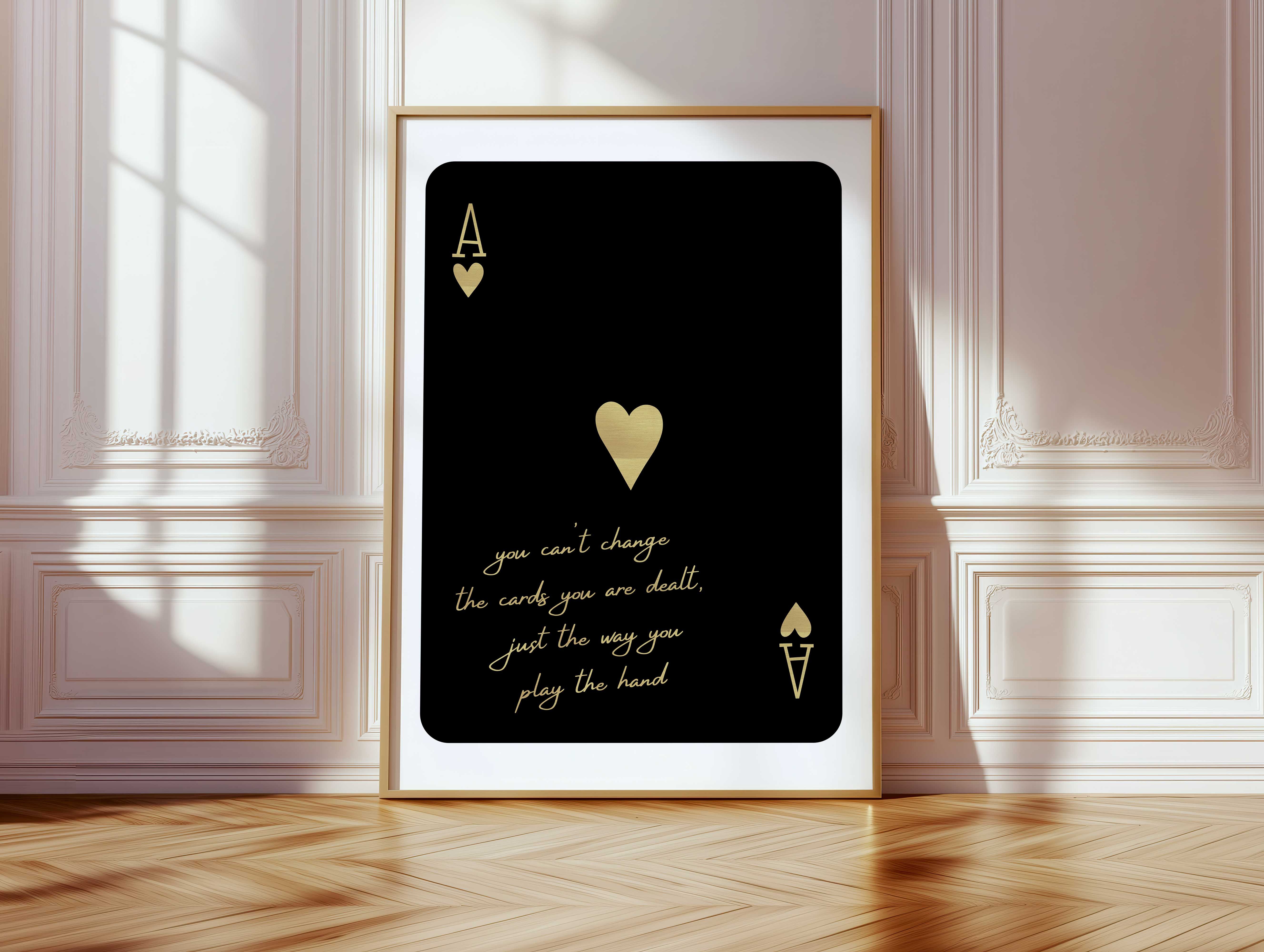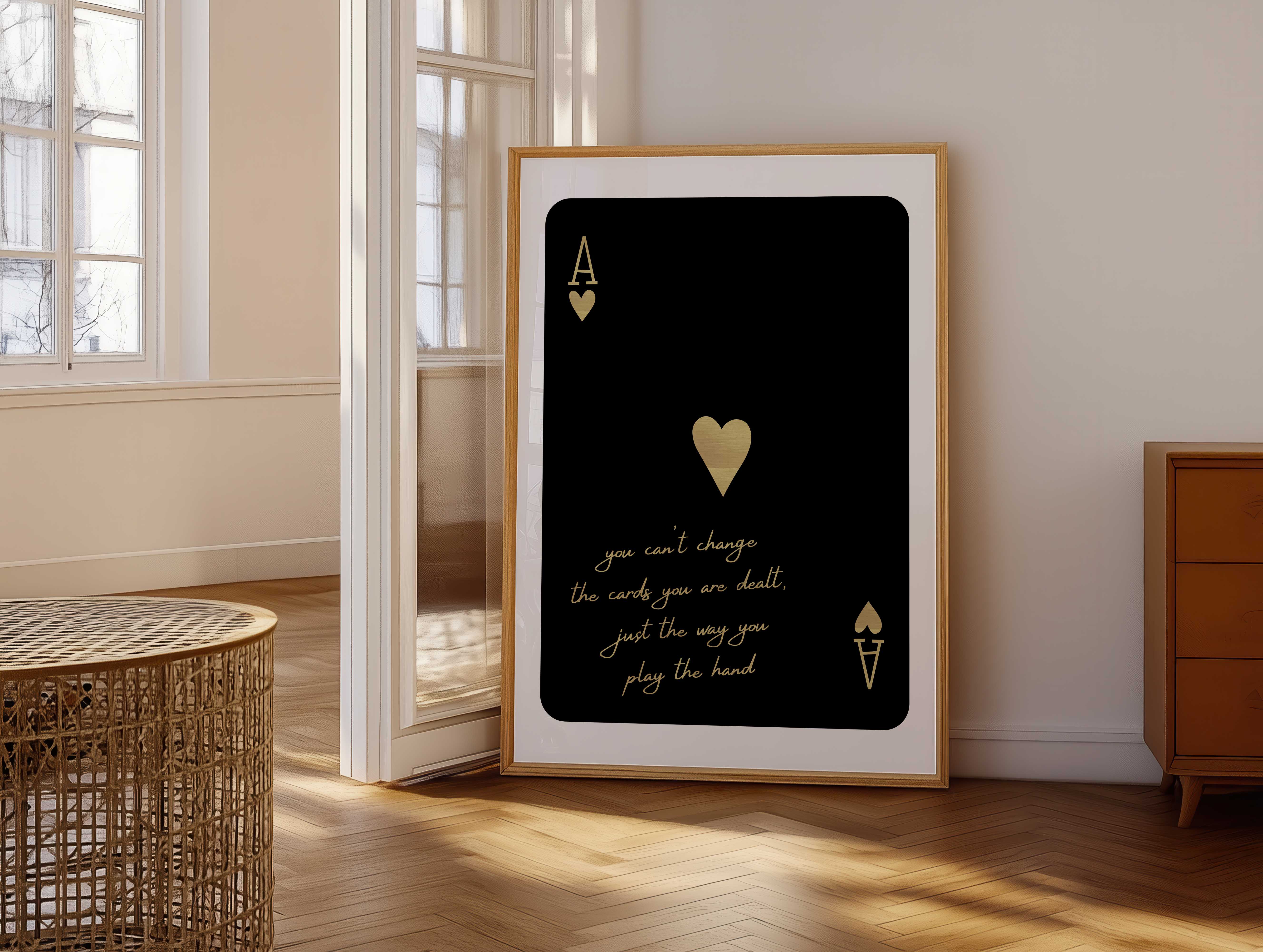 This poster features a powerful quote about accepting the cards you are dealt and finding new strategies to play the game. The elegant gold text stands out against a bold black background and is framed by a crisp white border, making it a perfect addition to any living space.