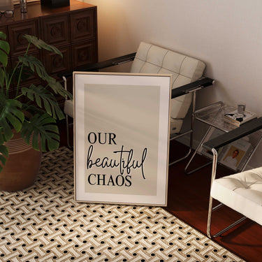This Our Beautiful Chaos Poster features a simple, yet elegant design with black text on a beige background and a white border. Perfect for displaying in the family home, it is a stylish way to remind your family of the chaos that brings everyone together.