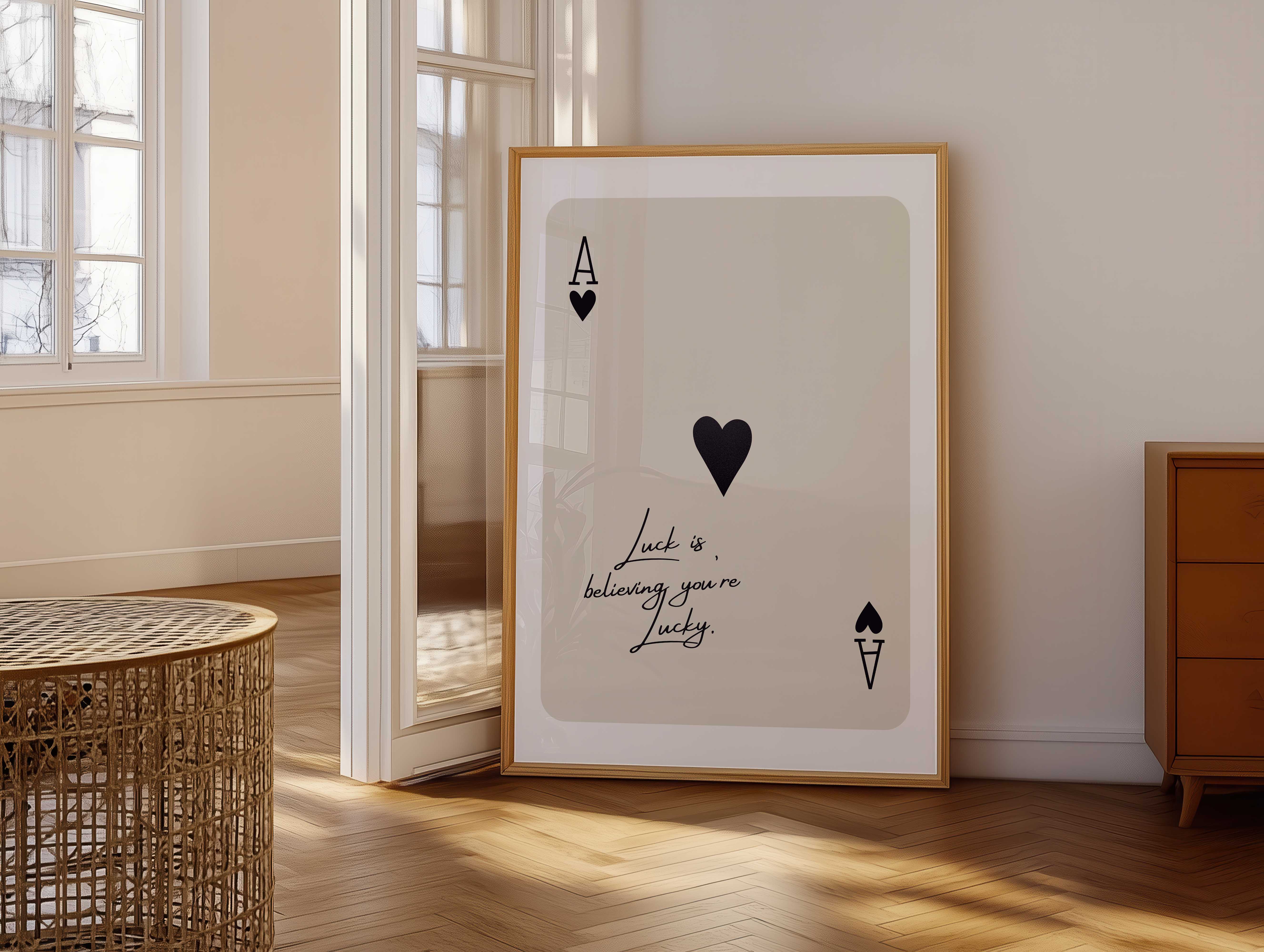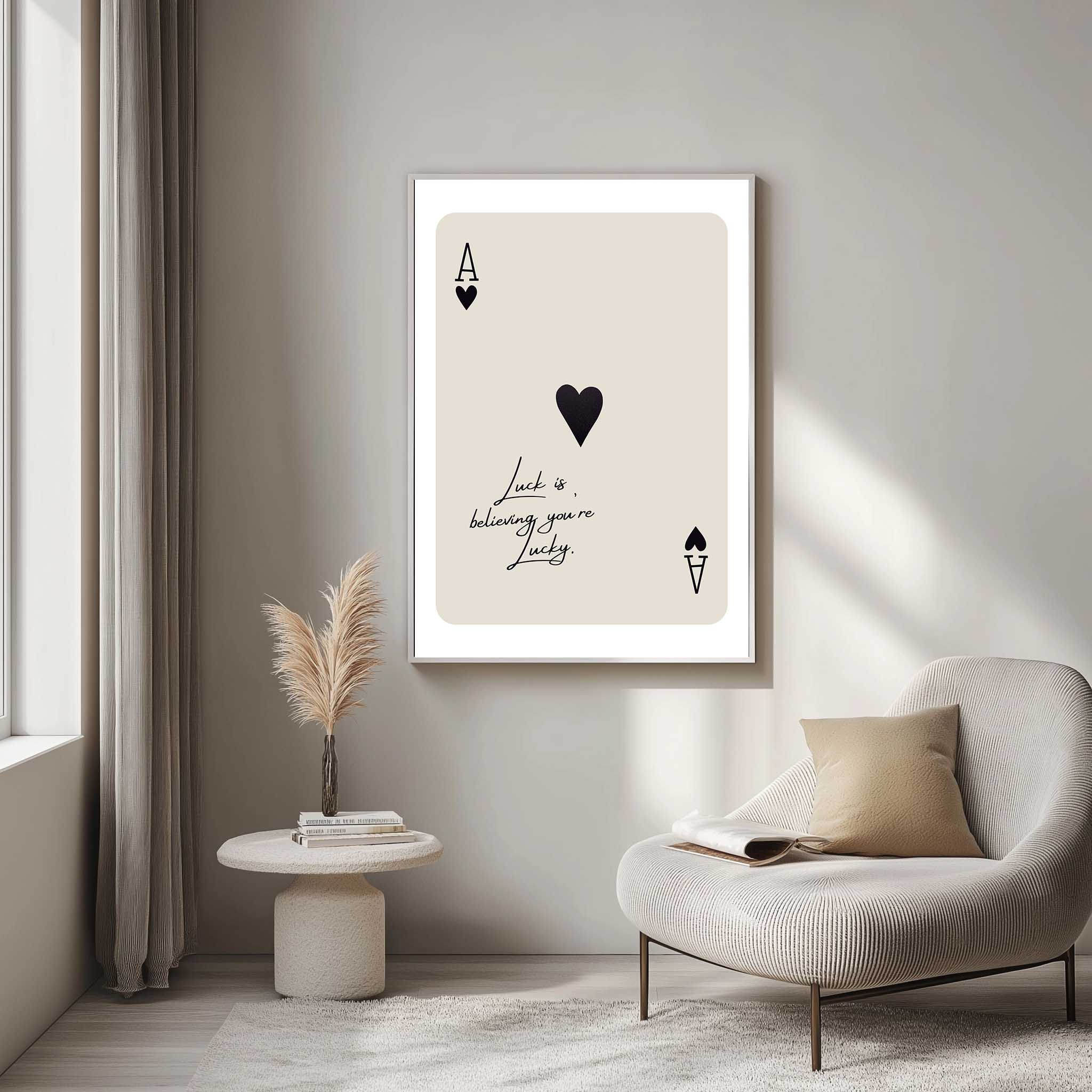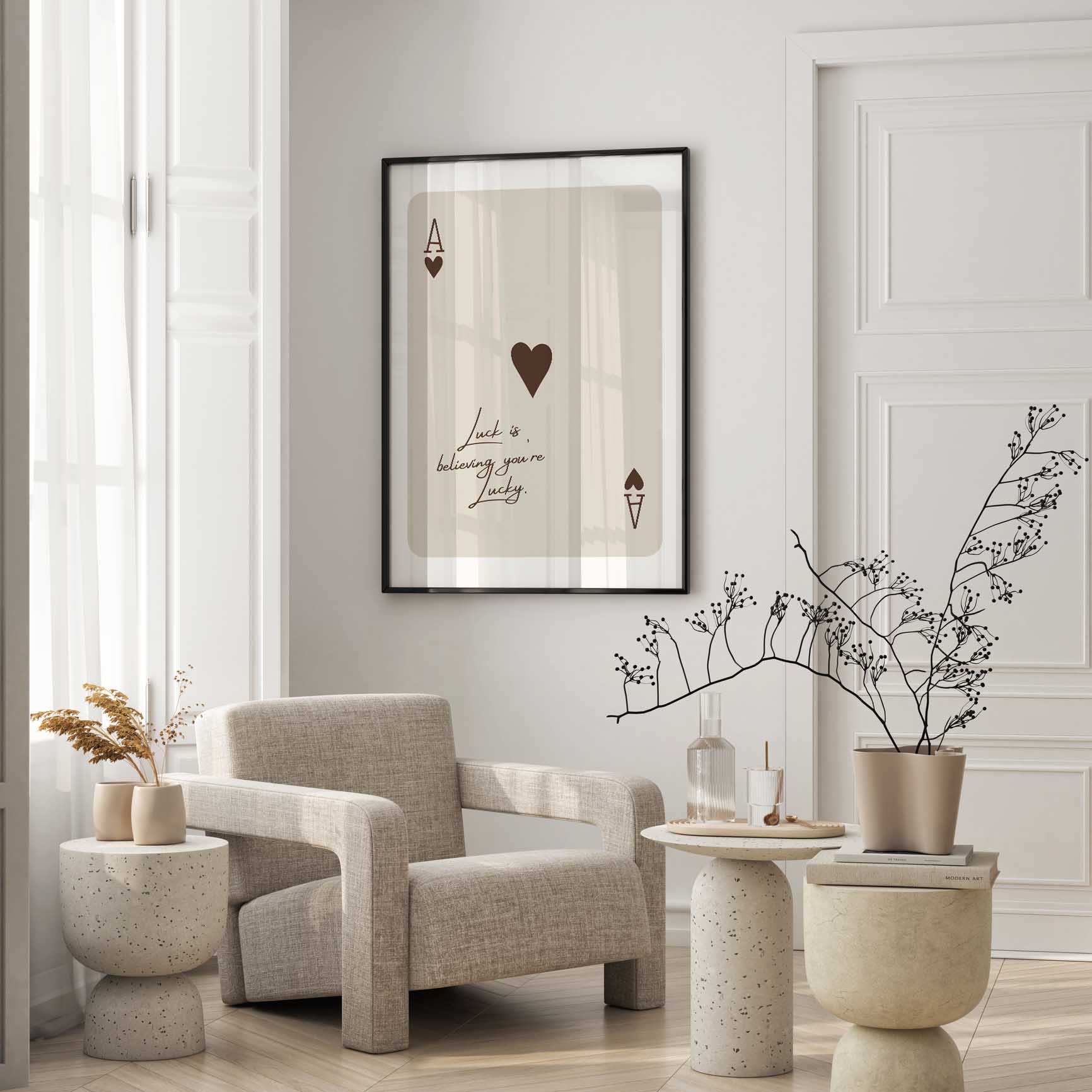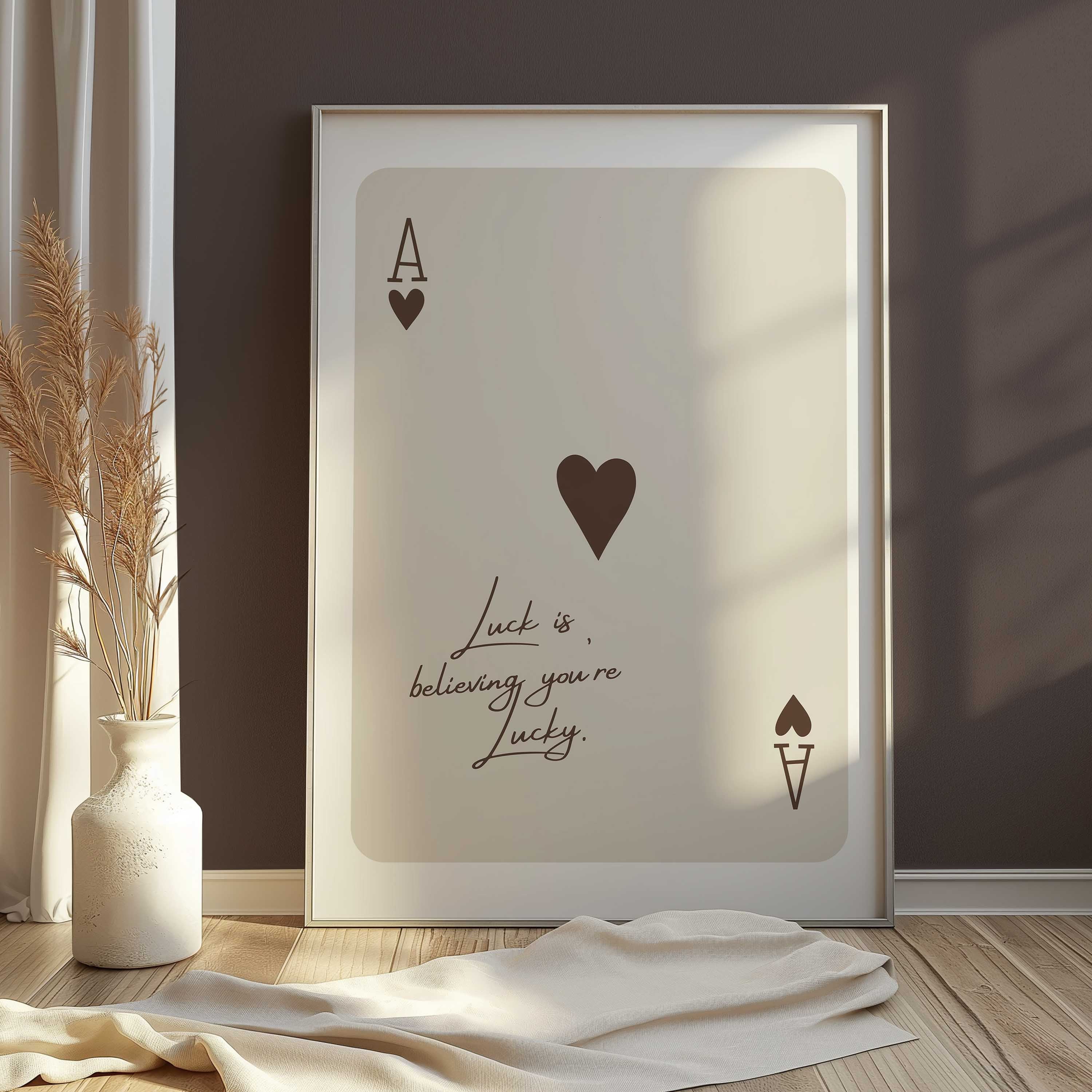 Emphasizing the power of belief, this poster serves as a visual reminder that luck is a mindset. The bold black or warm brown font stands out against the neutral beige background and is bordered by a clean white border or you can choose to have this borderless, making it a versatile addition to any room in your home.
