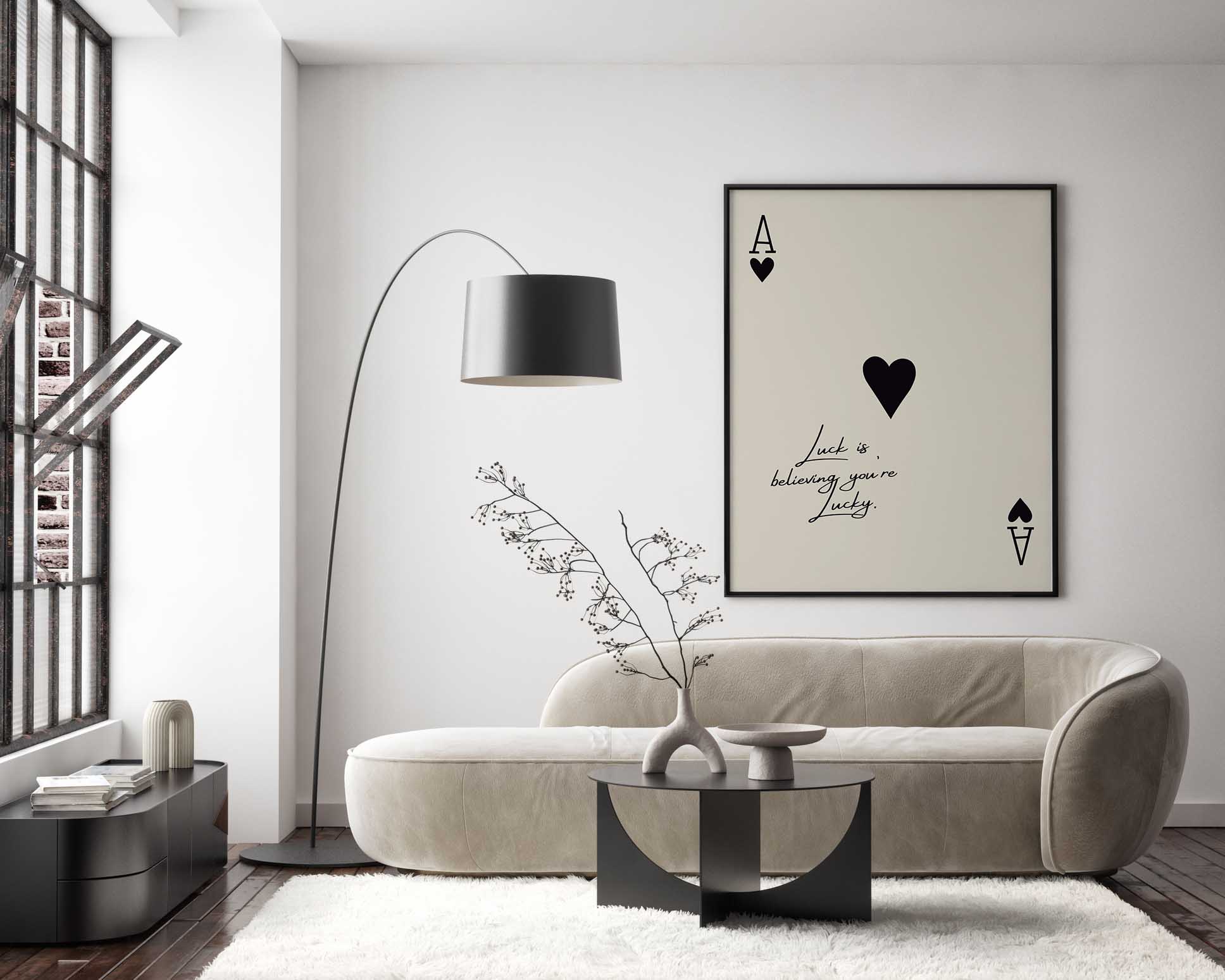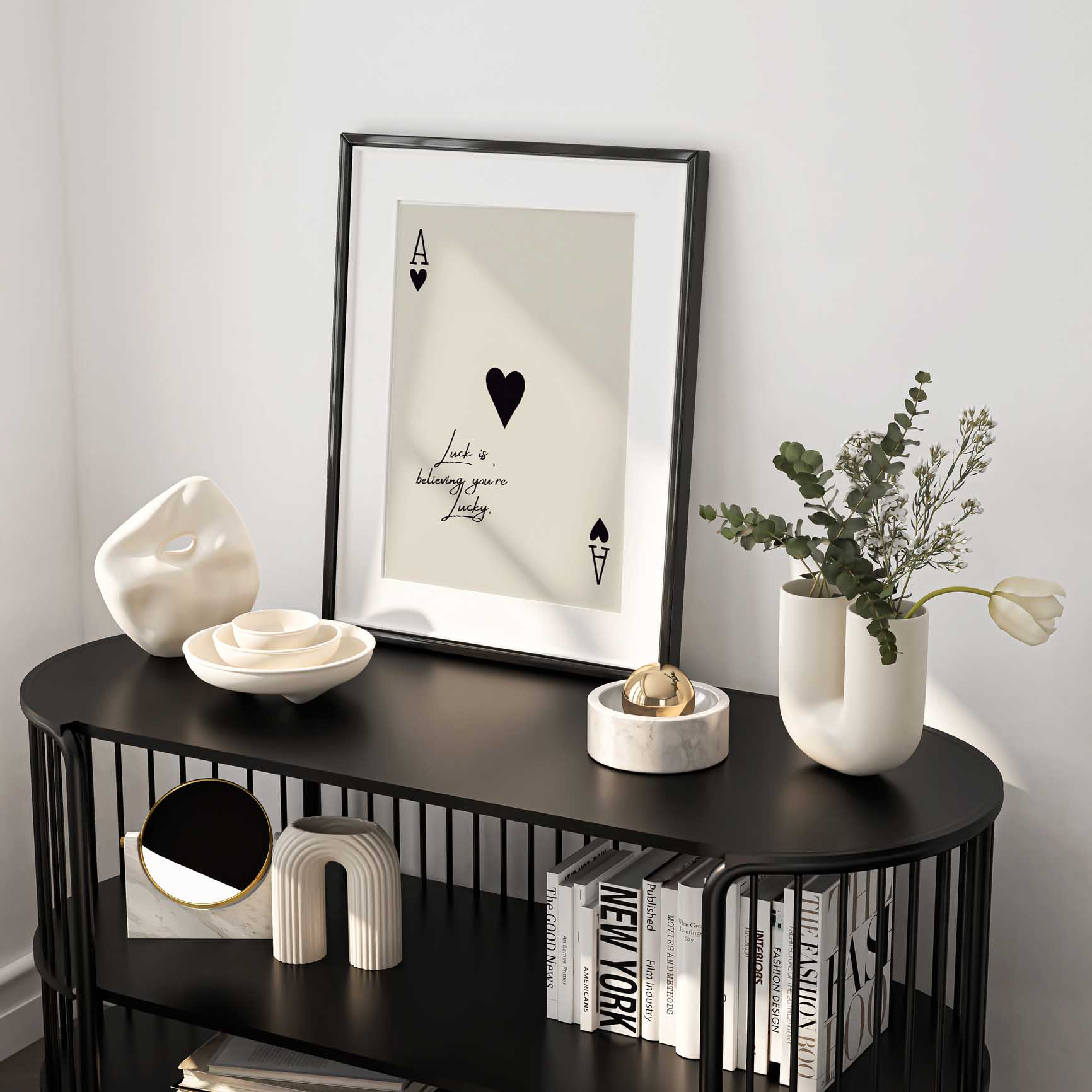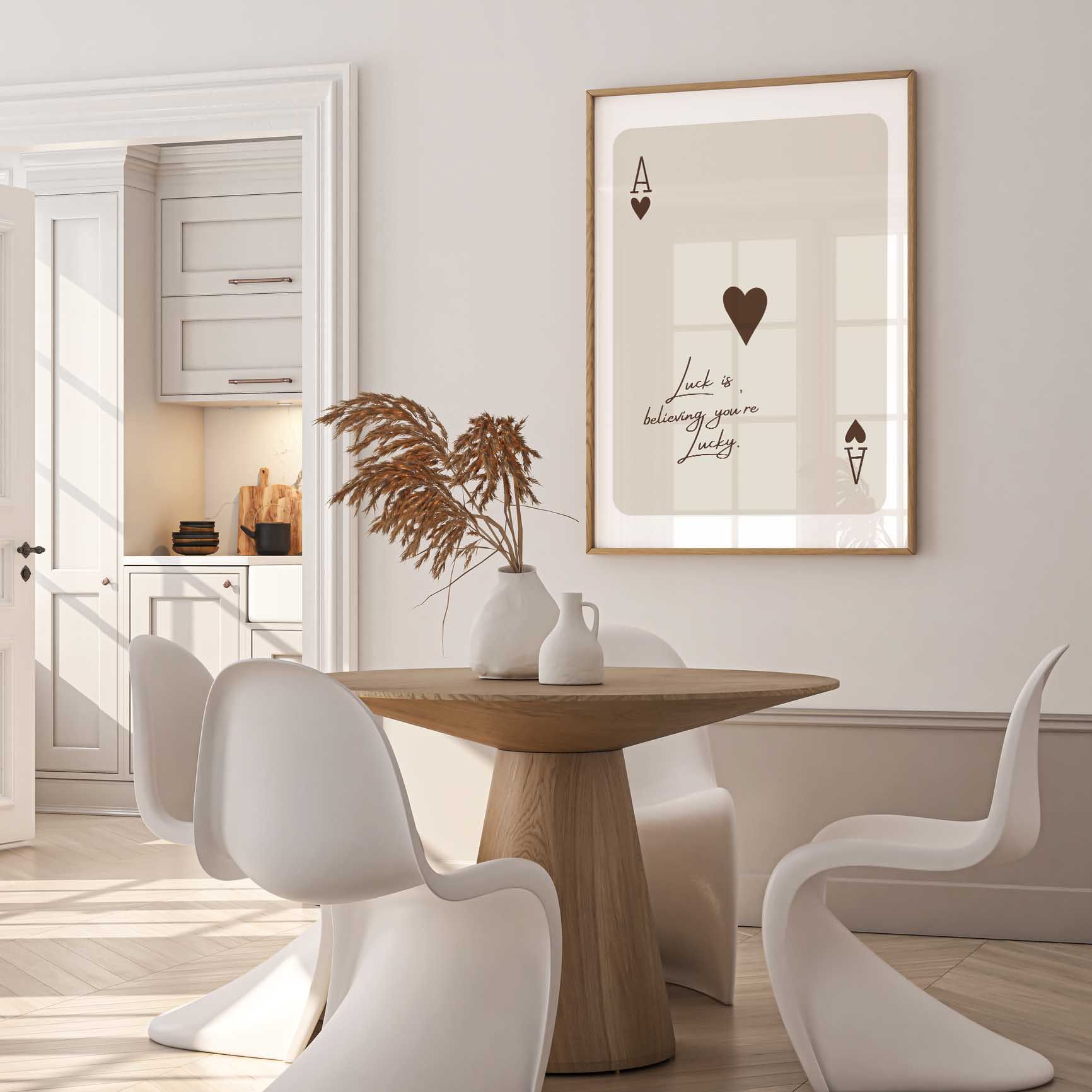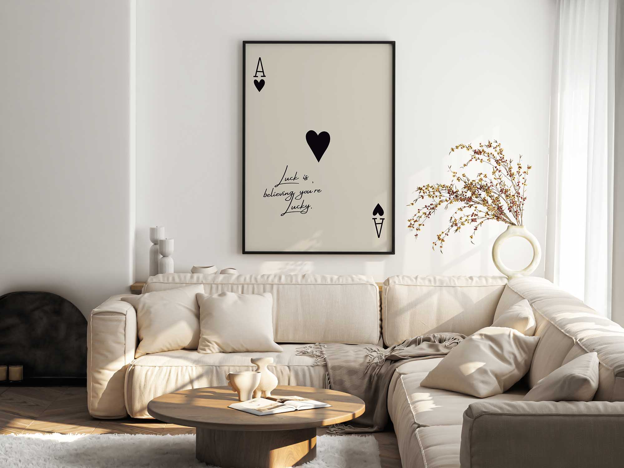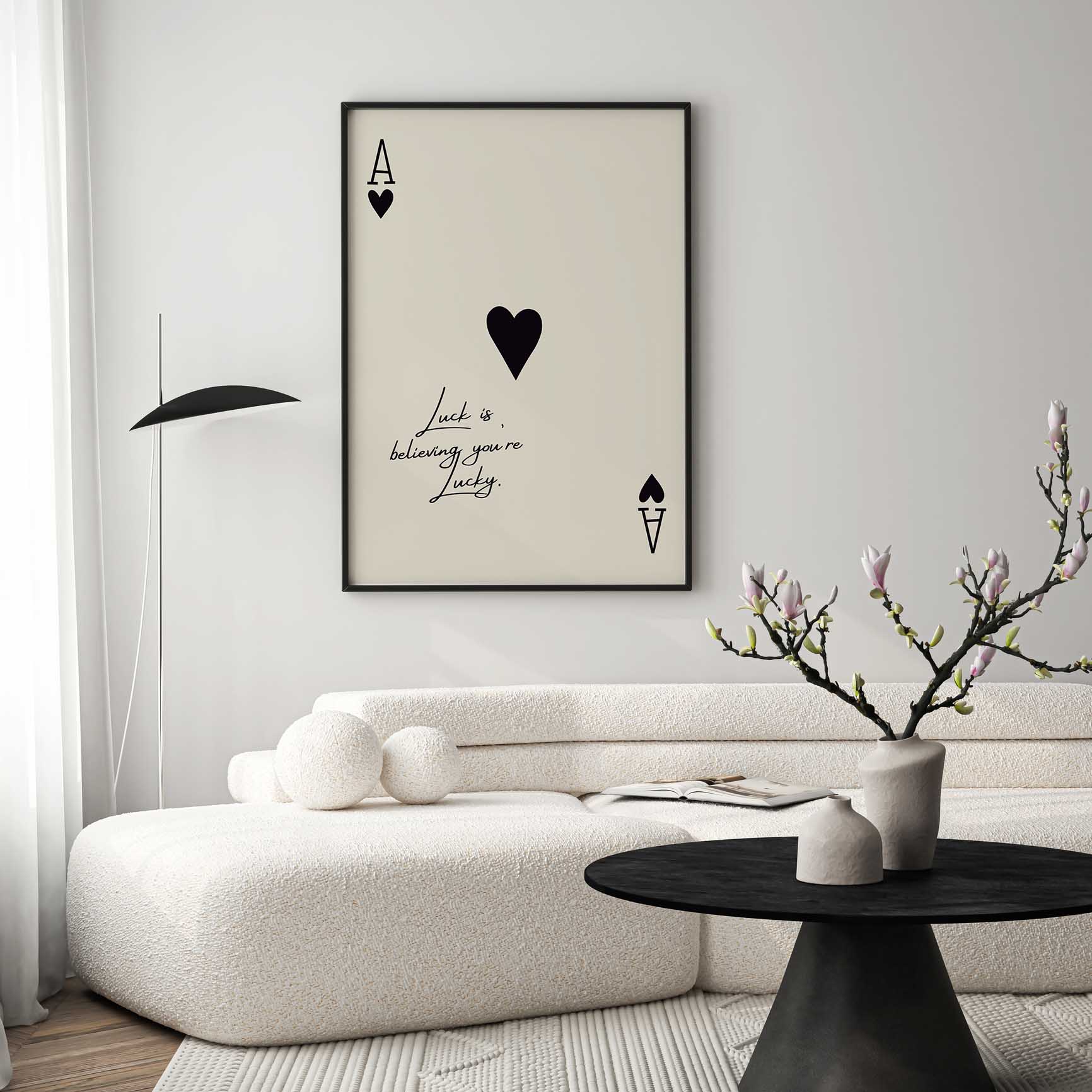 Emphasizing the power of belief, this poster serves as a visual reminder that luck is a mindset. The bold black or warm brown font stands out against the neutral beige background and is bordered by a clean white border or you can choose to have this borderless, making it a versatile addition to any room in your home.