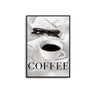 This poster showcases a monochrome image of a white coffee cup against white bedding, paired with sunglasses. The word "Coffee" is overlaid in black text. Add a modern and stylish element to your interior design.