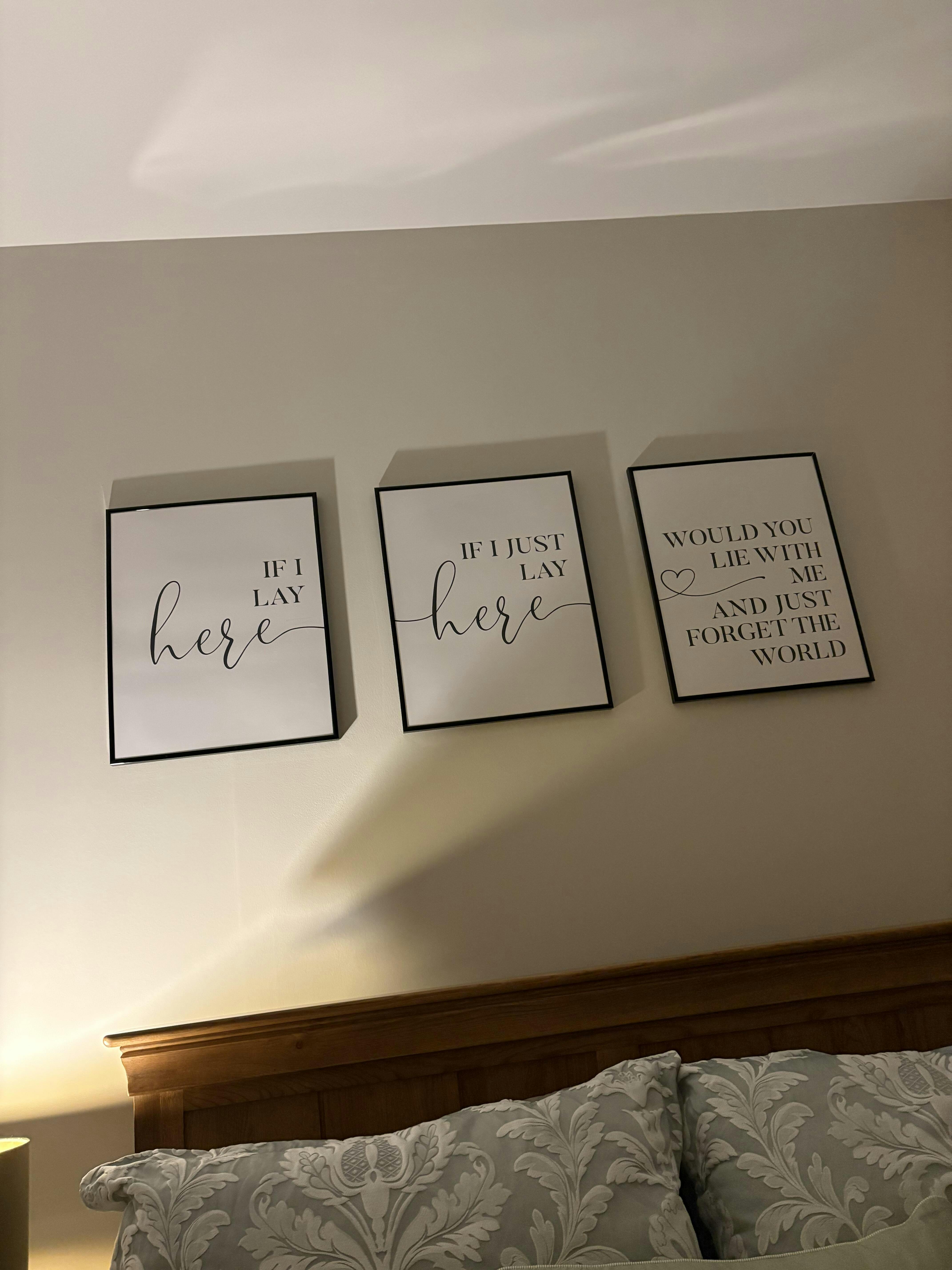 A calm, minimal print set inspired by the lyric “If I lay here, If I just lay here, Would you lie with me and just forget the world.”