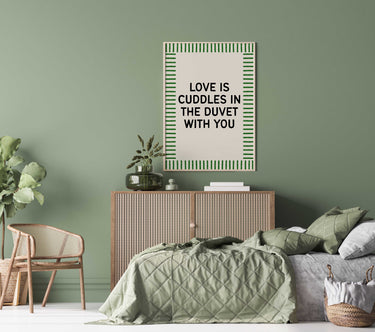 A cosy and heartfelt print perfect for the bedroom. Featuring the words “Love is cuddles in the duvet with you” this design brings warmth and affection to your space.