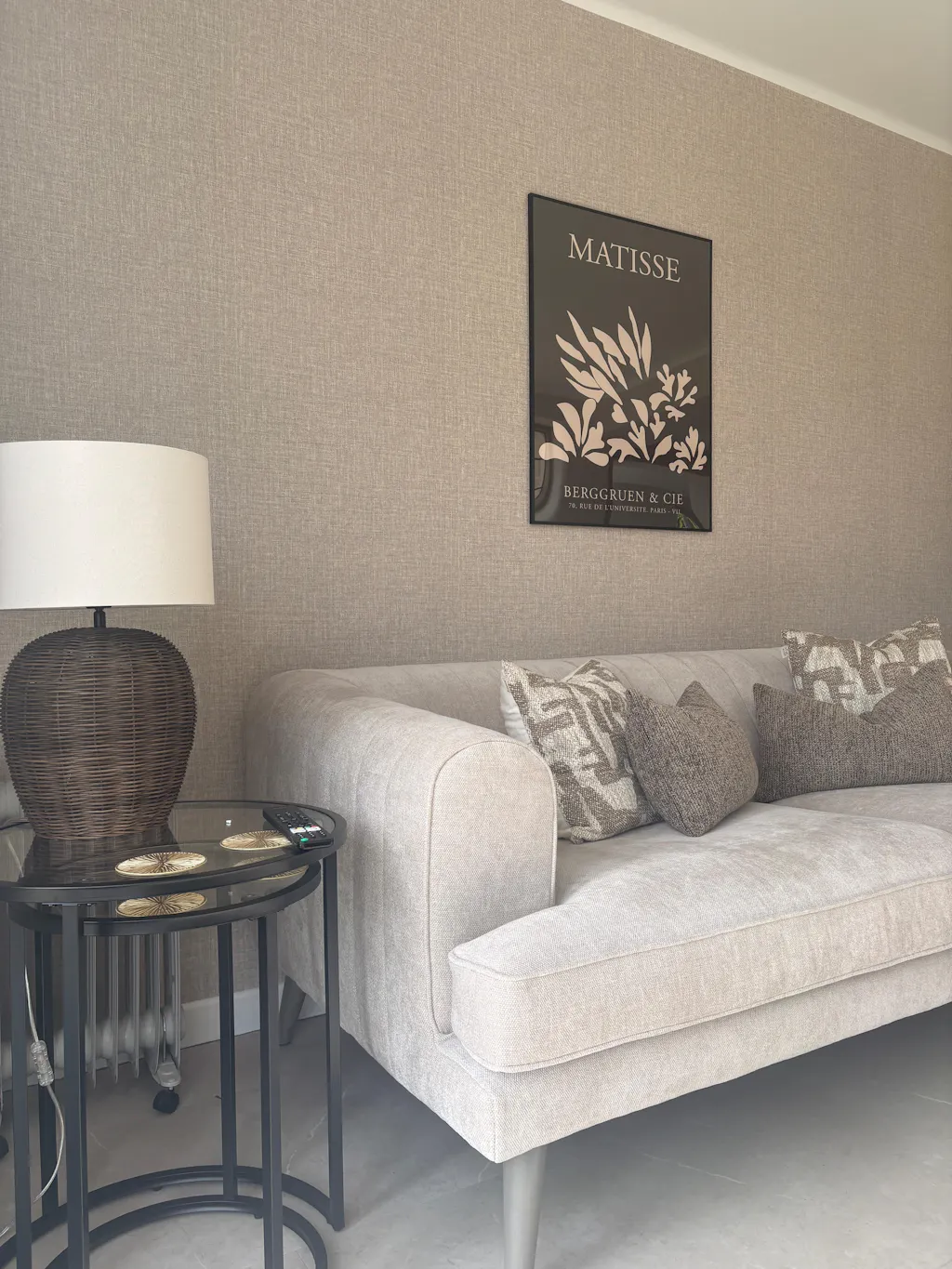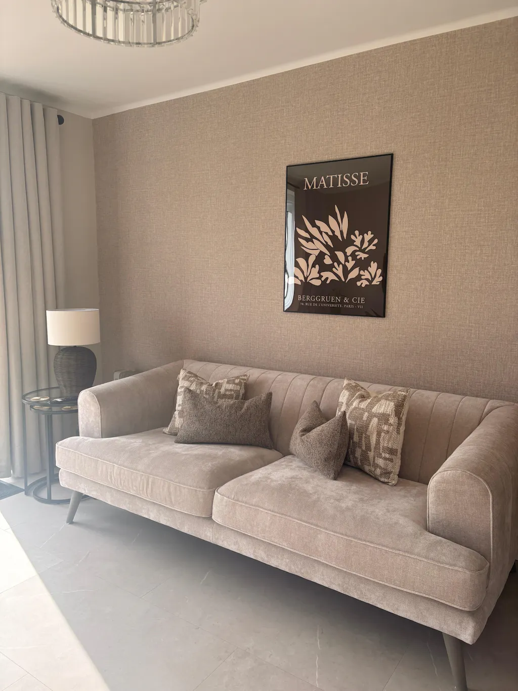 This poster presents a refined beige Matisse-inspired curved cut-out motif on a deep brown background, ideal for adding a touch of elegance to any interior setting.