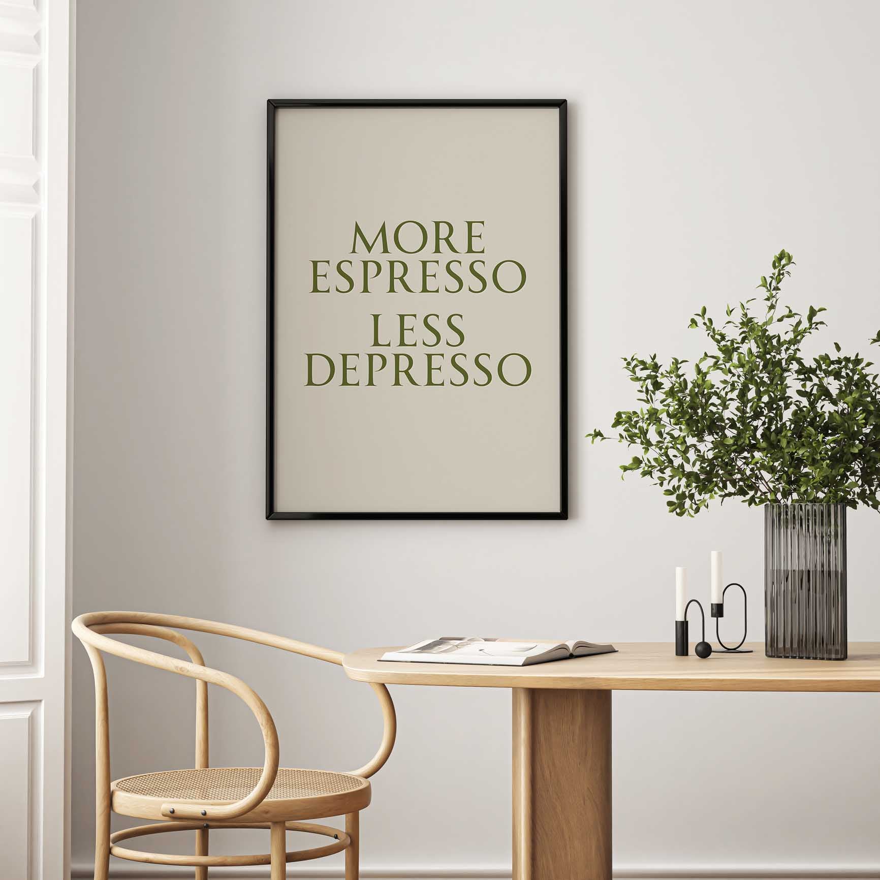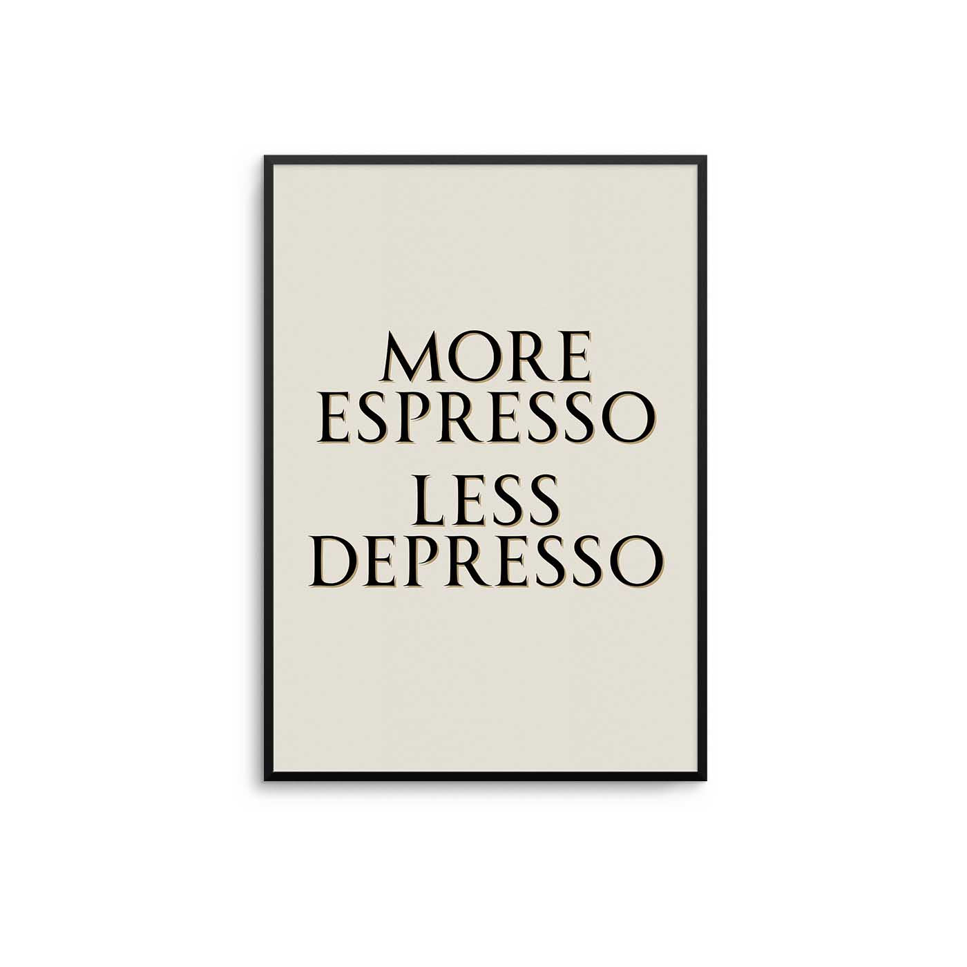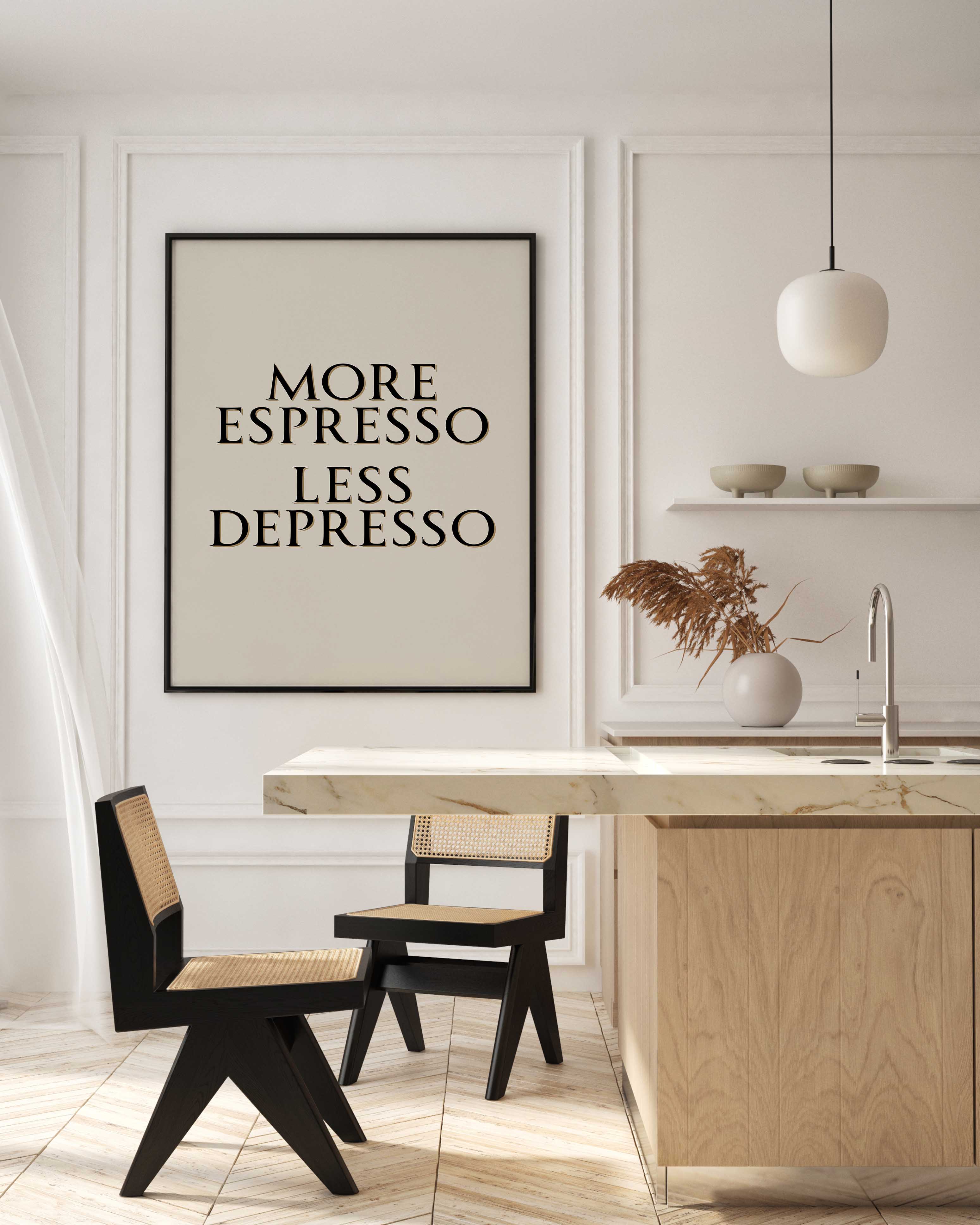 Add a playful touch to your space with our “More Espresso Less Depresso” print — a witty nod to coffee lovers and modern minimalists alike. Featuring bold typography on a choice of 4 background colours, this print brings personality and charm to your kitchen, coffee nook, or office.