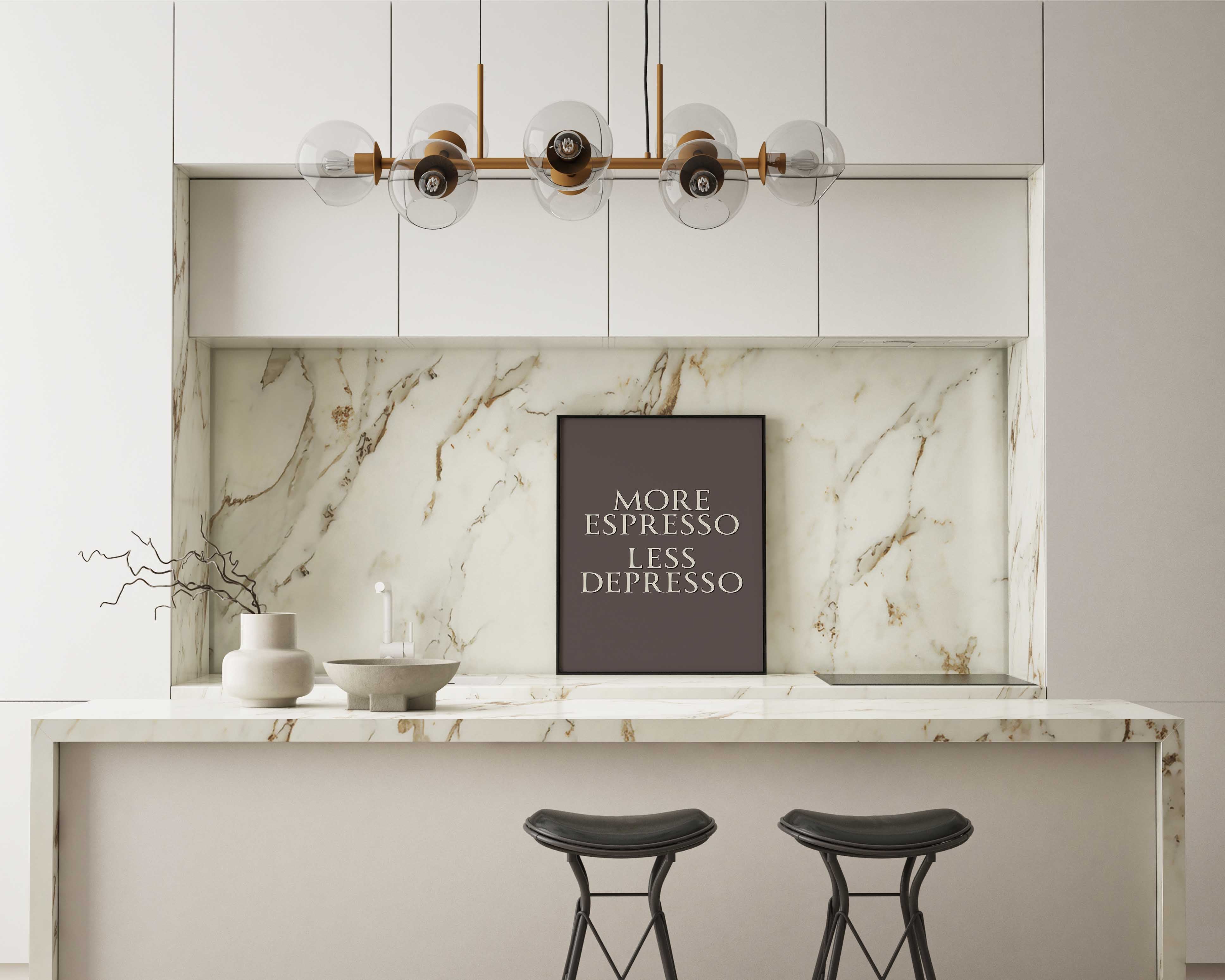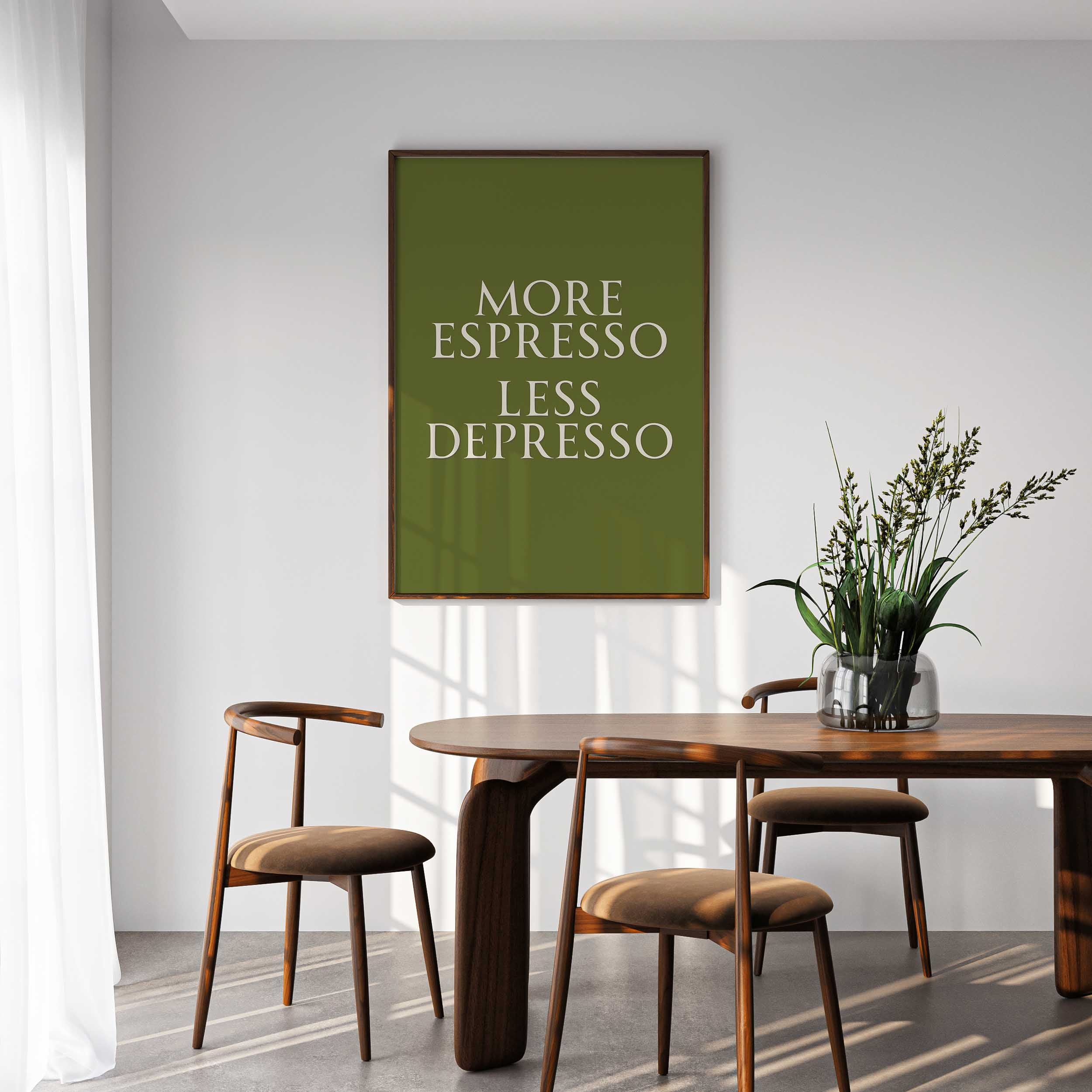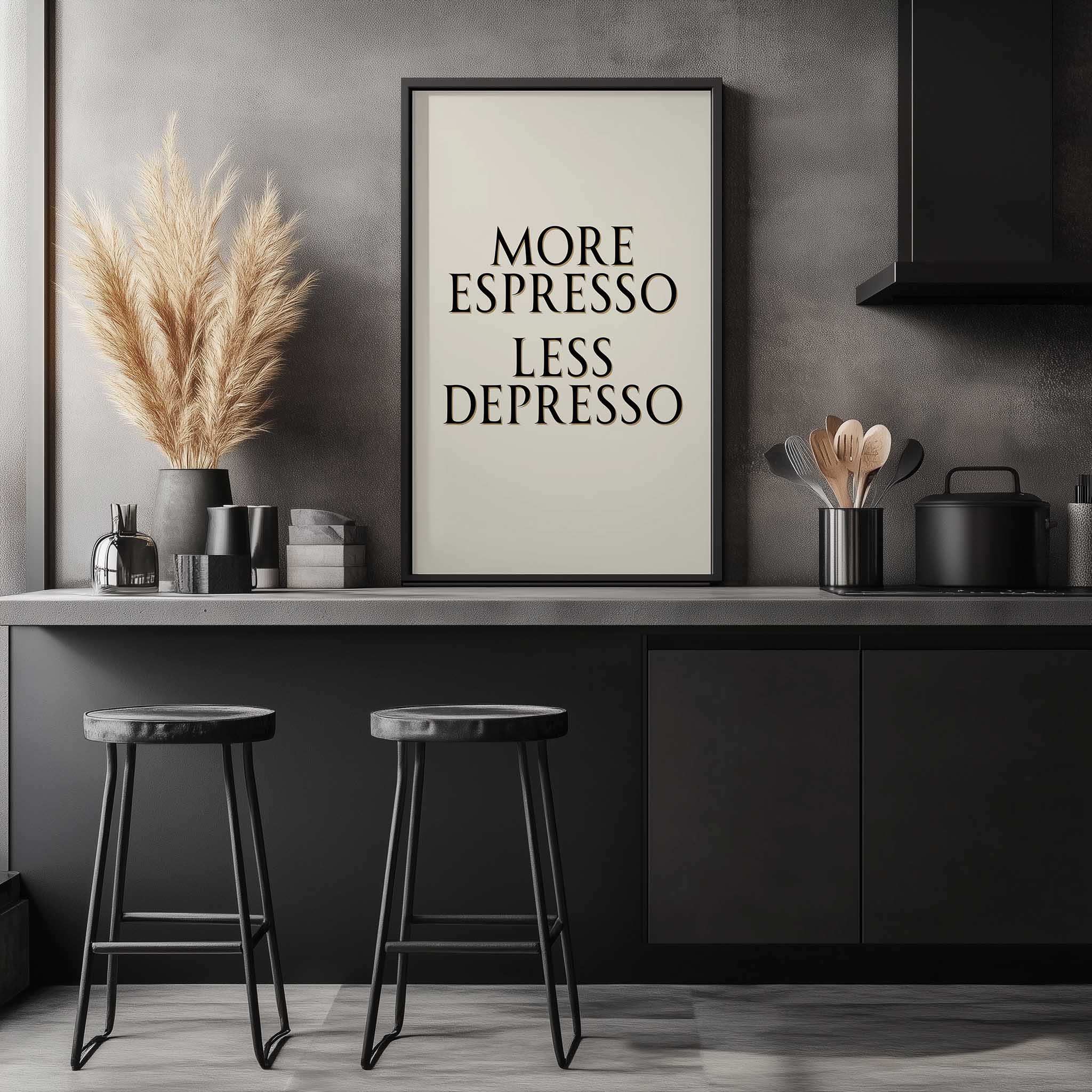 Add a playful touch to your space with our “More Espresso Less Depresso” print — a witty nod to coffee lovers and modern minimalists alike. Featuring bold typography on a choice of 4 background colours, this print brings personality and charm to your kitchen, coffee nook, or office.